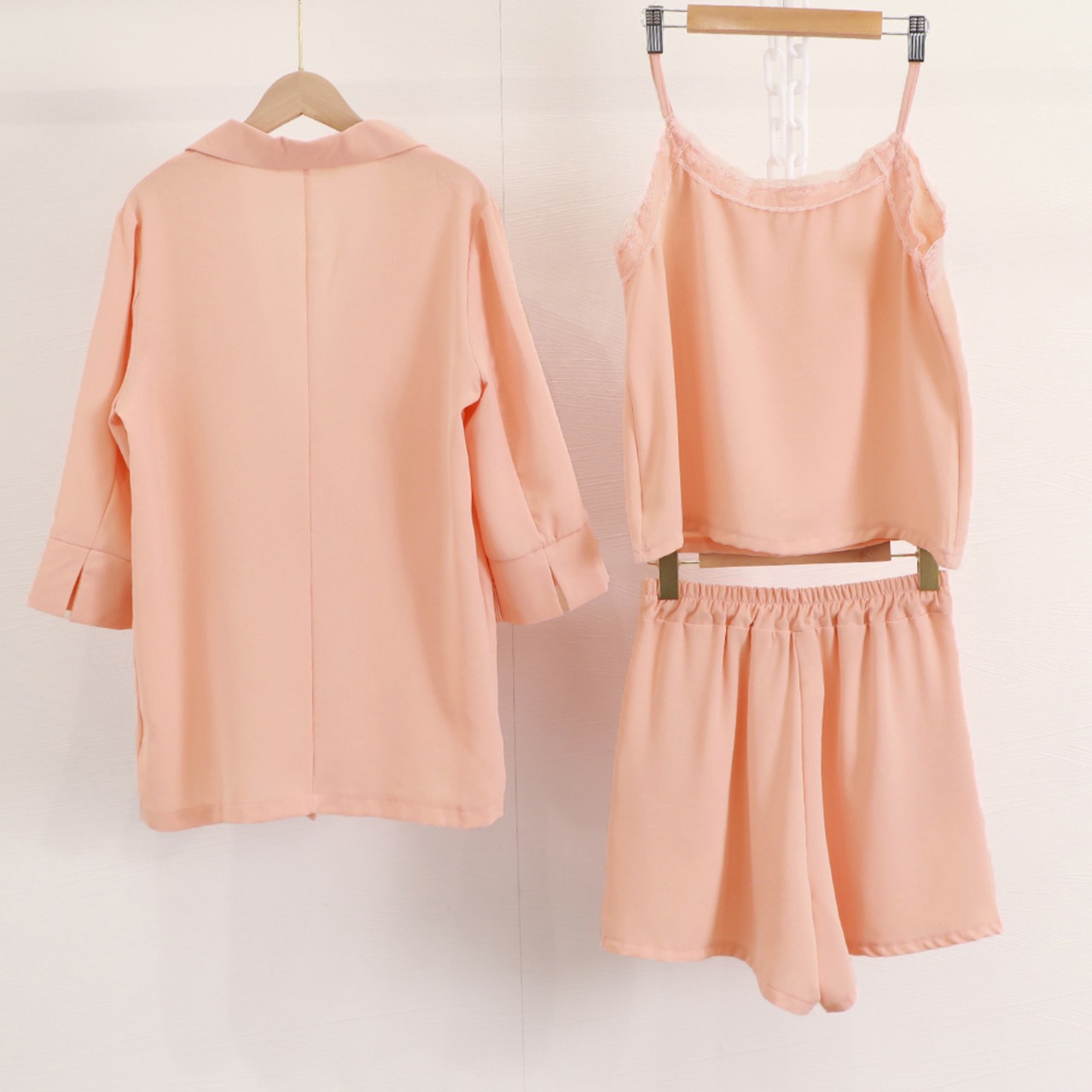 キャミソールの胸元に繊細なレース付き、フレア裾のショートパンツはタック入り仕様、ロング丈のジャケットはロールアップ袖、シンプルフォルムながらも細部までこだわるデザイン