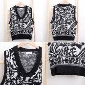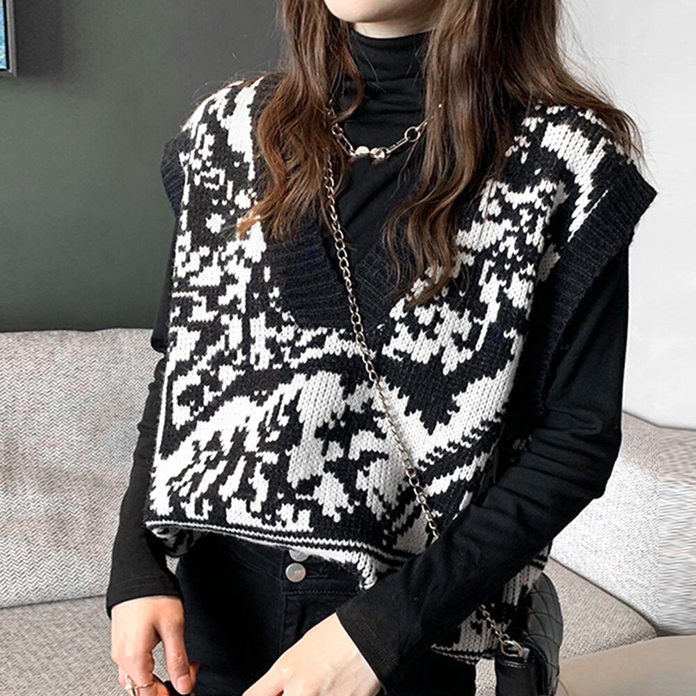 柄 ジレベスト 黒 ノースリーブ トップス 重ね着 プルオーバー チョッキ 人気 無地 配色ニット オフィス 通勤 学院風