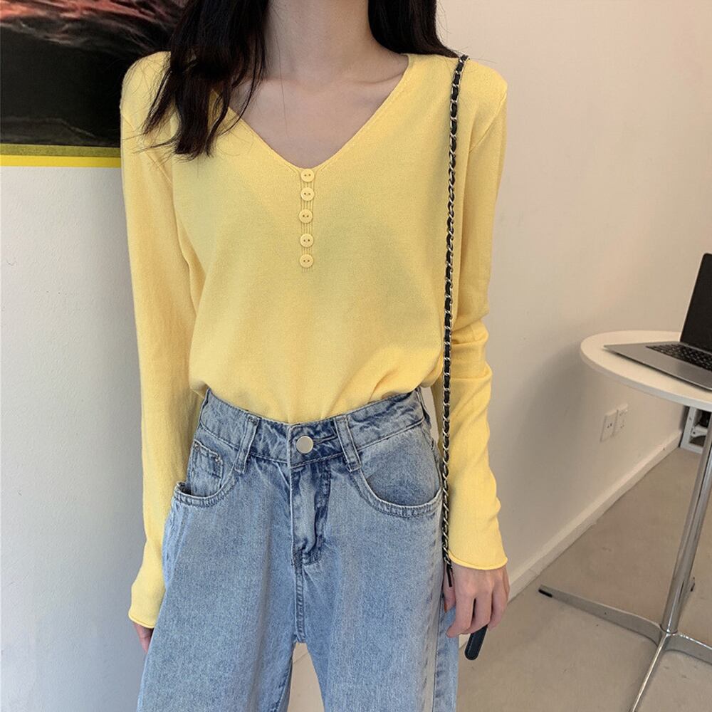 フロントにボタンをあしらった、大人カジュアルなVネックニットトップス