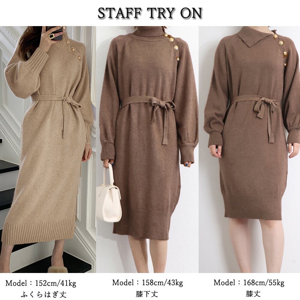 ロングワンピース ウエストマーク おしゃれ タートルネック ミモレワンピ 着やせ 体型カバー 大人かわいい 30代40代
