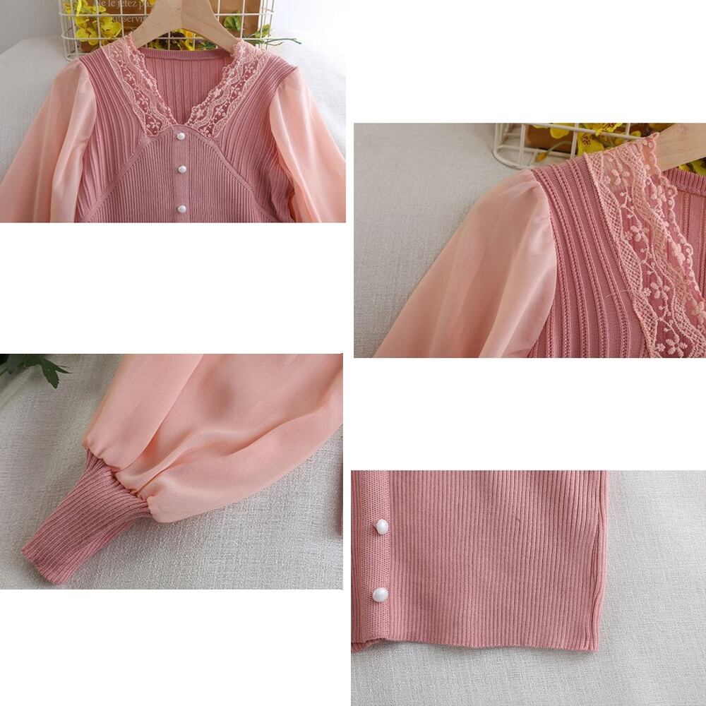 リブニット レース シフォン切り替え ニットセーター 20代 30代 ニットウェア プルオーバー 着回し 無地