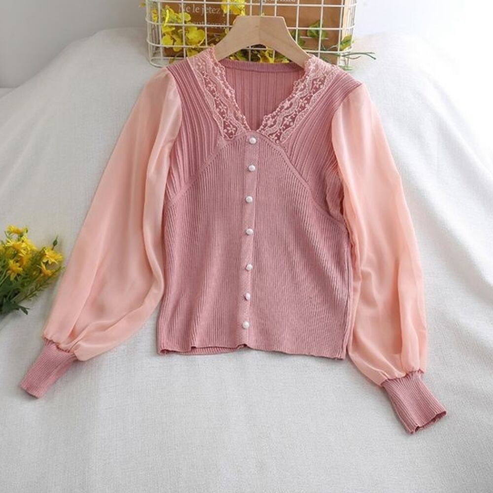 胸元繊細な刺繍レースとシフォン袖で切り替え、センシュアルなアクセントを添えた長袖ニット