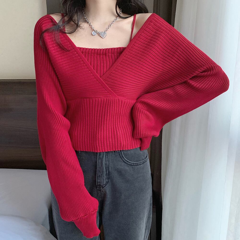 リブニットのキャミソールとカシュクールニットのドッキングデザインなので、1枚で簡単にレイヤード風のスタイリングがかなう