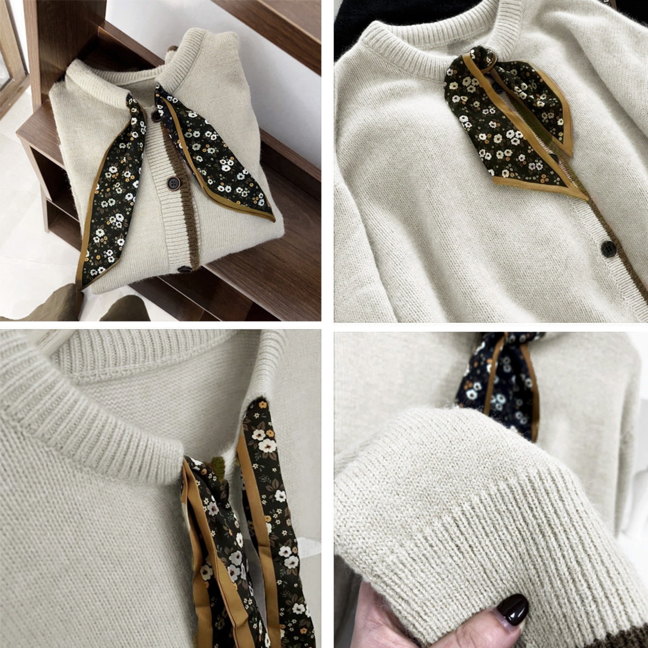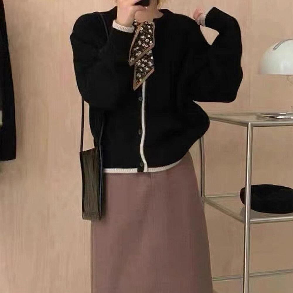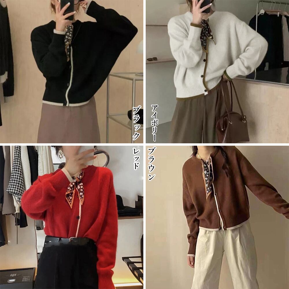 シンプルの無地生地に配色ラインを加えてボウタイスカーフをプラス、カジュアルながらも上品に仕上げたニットカーディガン