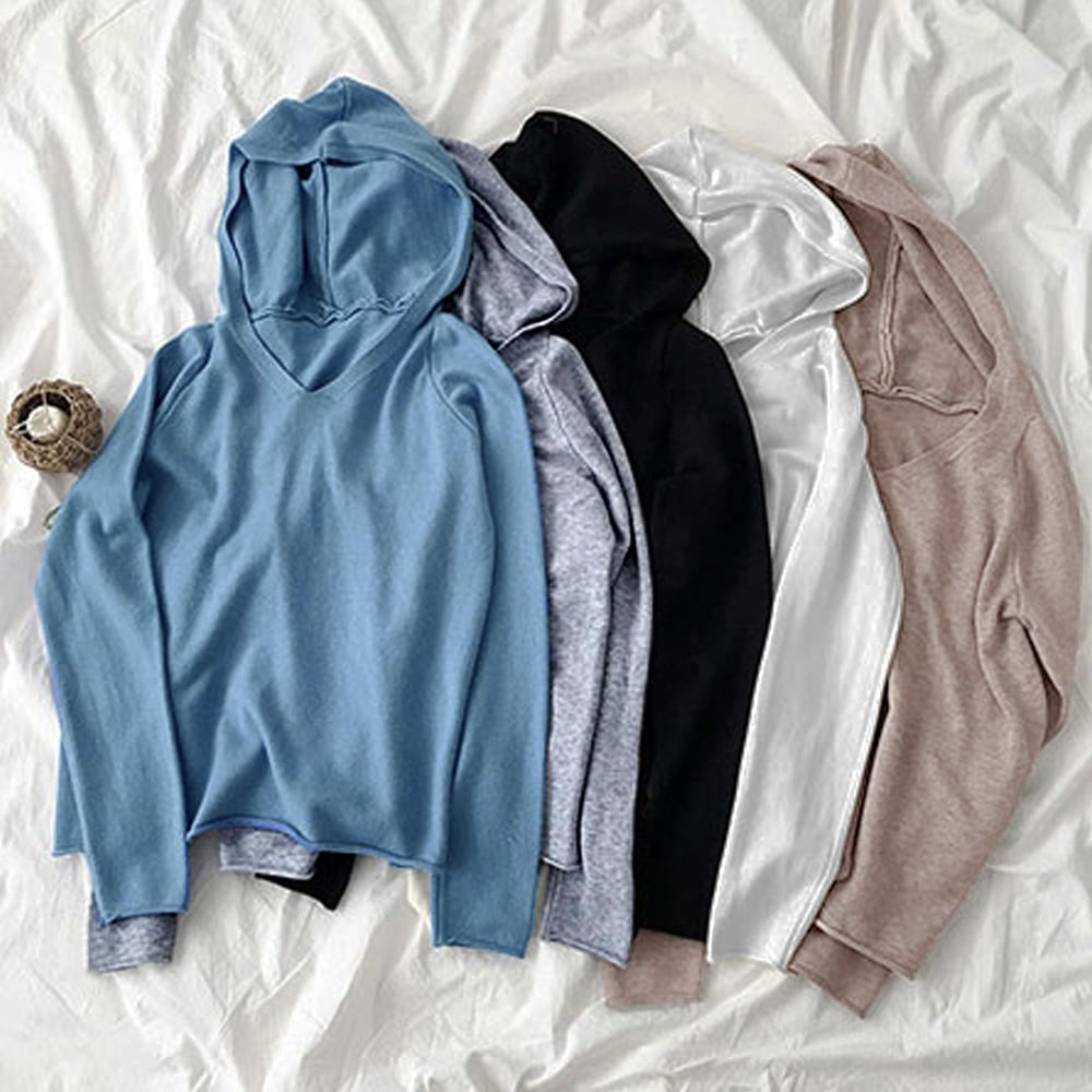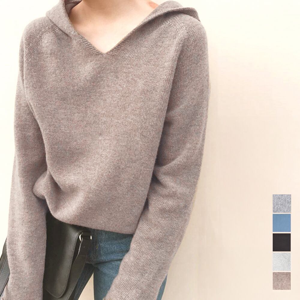フード付き ニットトップス レディース Vネック ニットセーター 長袖 シンプル ニットパーカー プルオーバー 秋冬