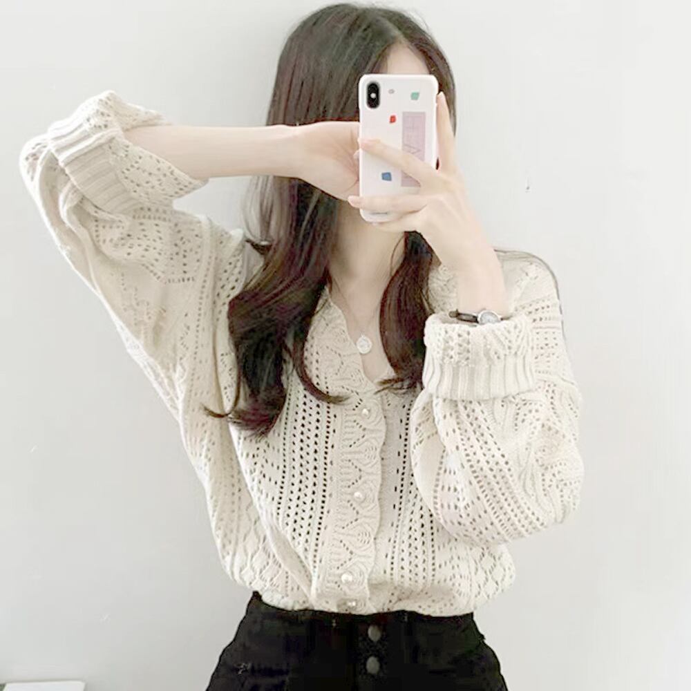 ゆるっとしたシルエットとぽわん袖がトレンド感満載の透かし編みロングスリーブニットカーディガン