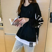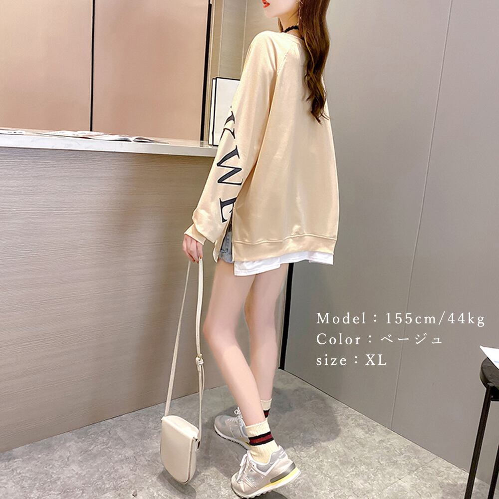 レイヤード風トップス おしゃれ ゆったりトレーナー 体型カバー 春秋服ストリート 重ね着風 スウェットカットソー ロゴT