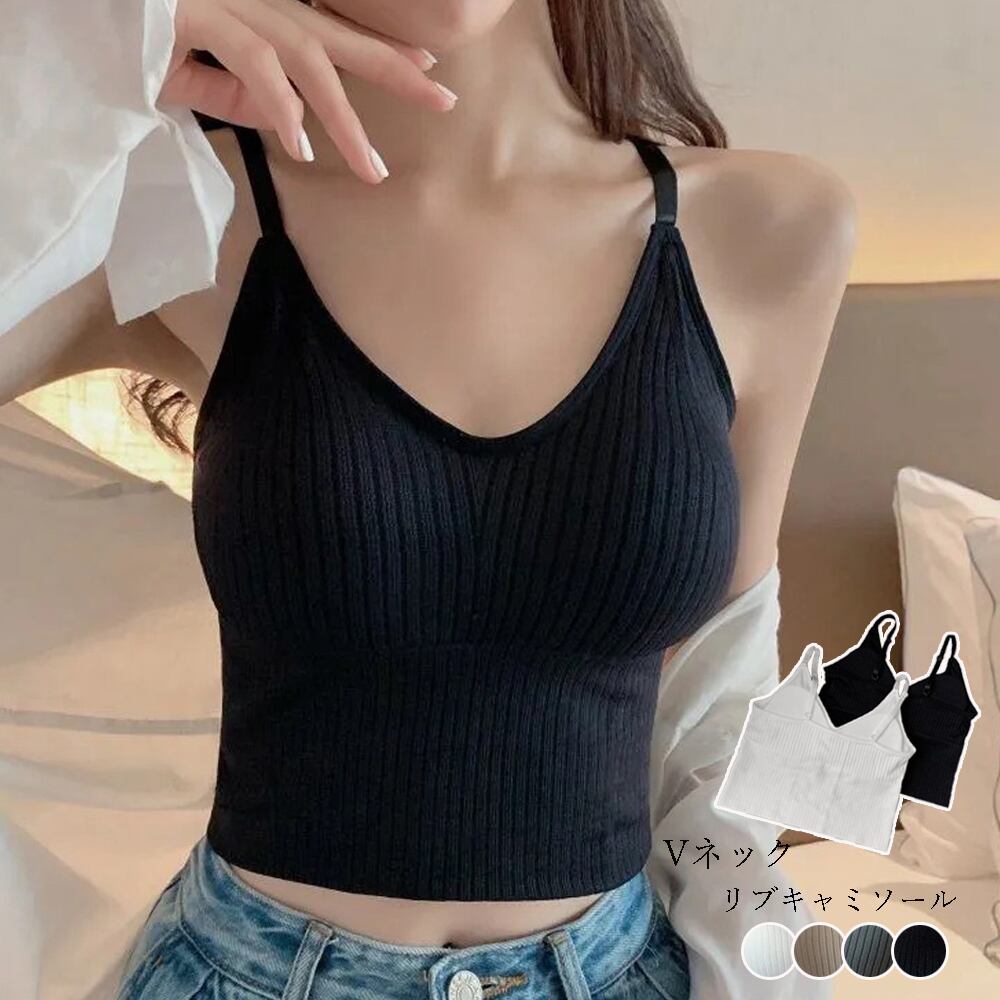 Vネックデザインなのでデコルテを美しく魅せてくれるリブ生地のカップ付きキャミソール