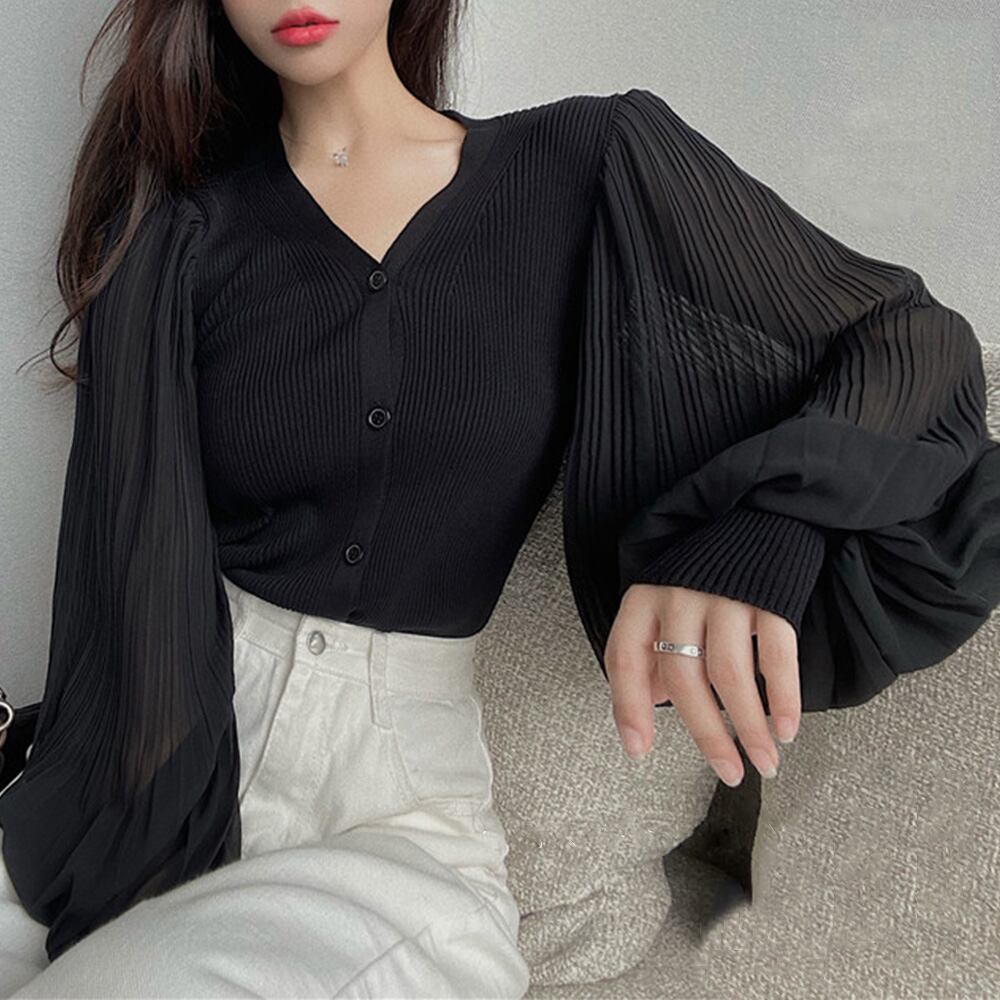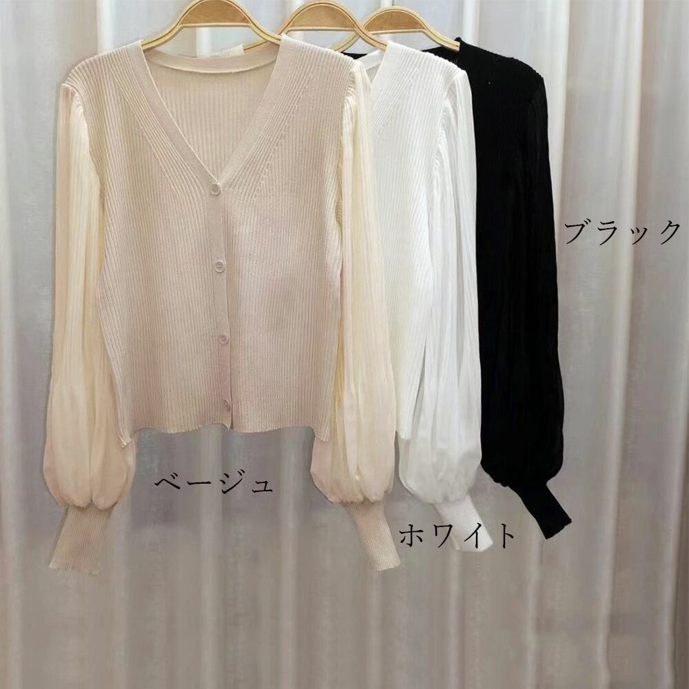 レディース ニットブラウス 異素材 切り替え トップス ランタンスリーブ 羽織 前開き 無地 こなれ感 ブラウス 通学
