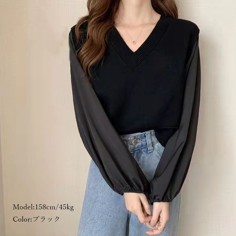 袖切替 トップス 着やせ ブラウス 韓国風 ニットソー