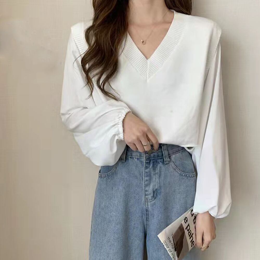 ブラウスにニットベストを重ねたようなレイヤード風のトップス