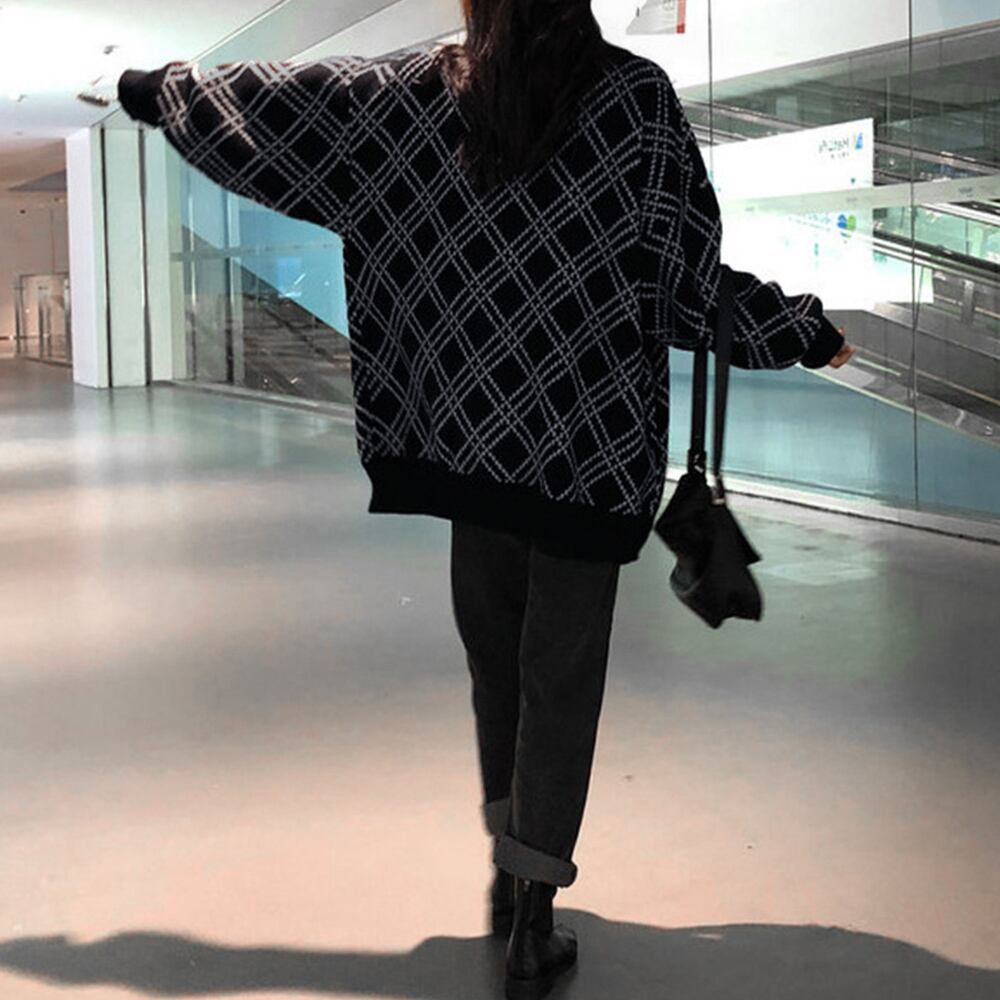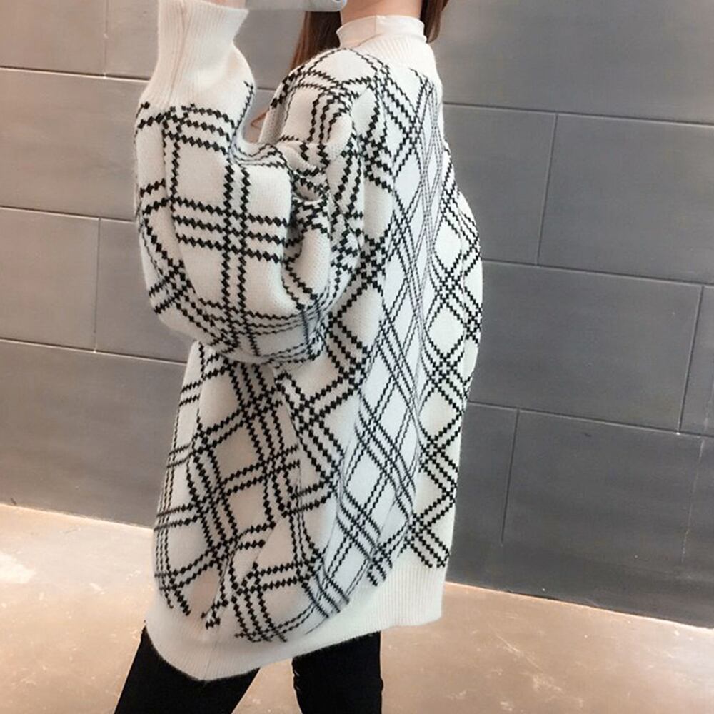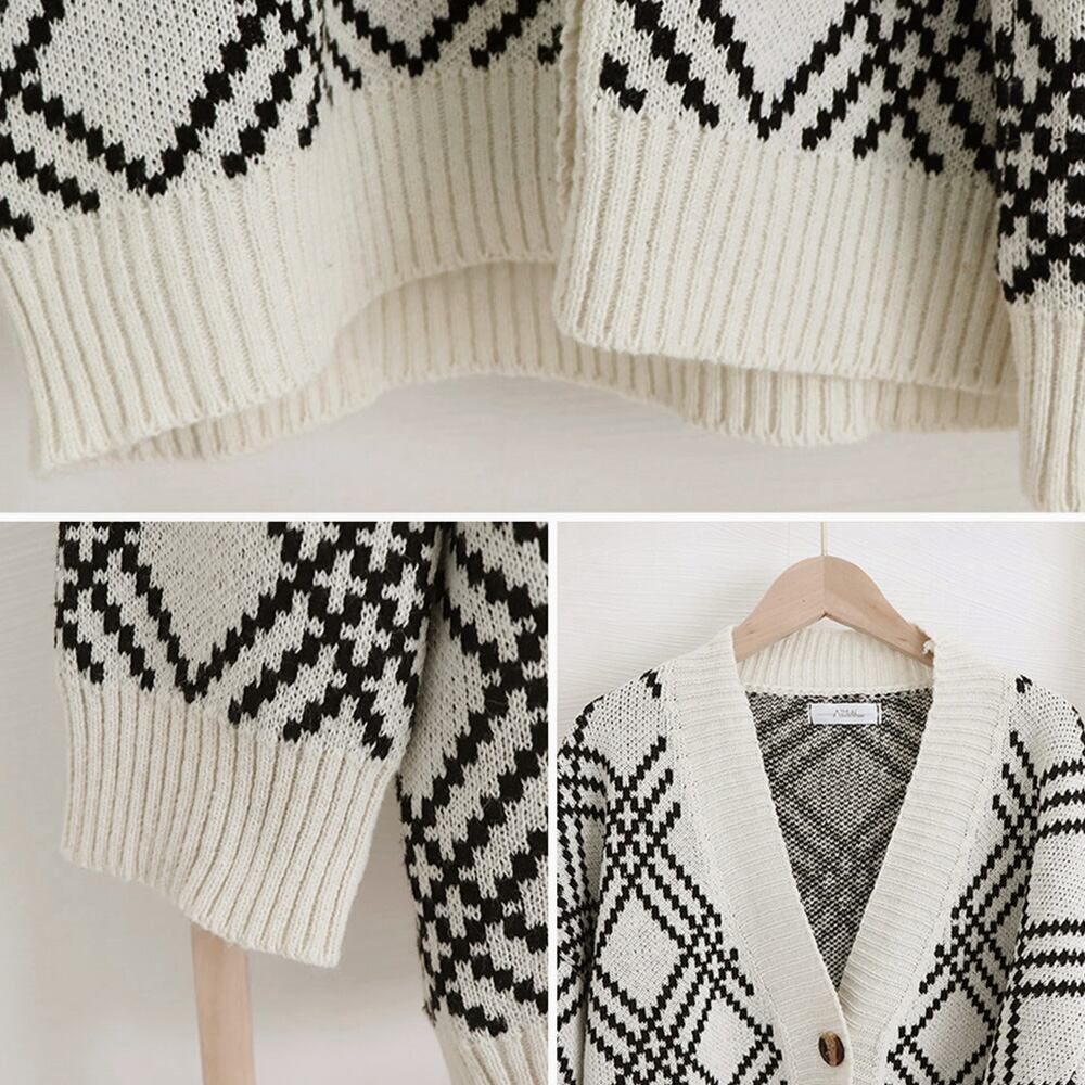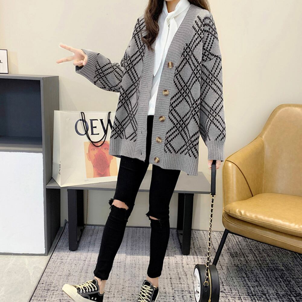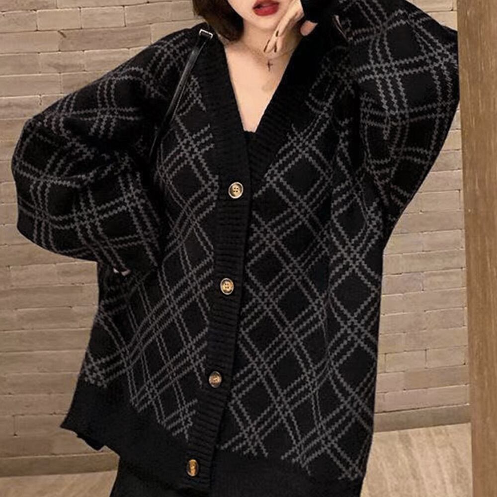 斜めダイアゴナルチェック柄の配色ラインがシックでモダンな今風Vネックロングスリーブカーディガン