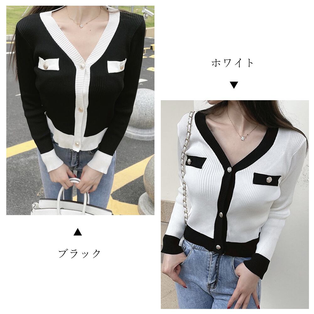 襟から前立ての部分が配色になった、バイカラーデザインがポイントのニットカーディガン