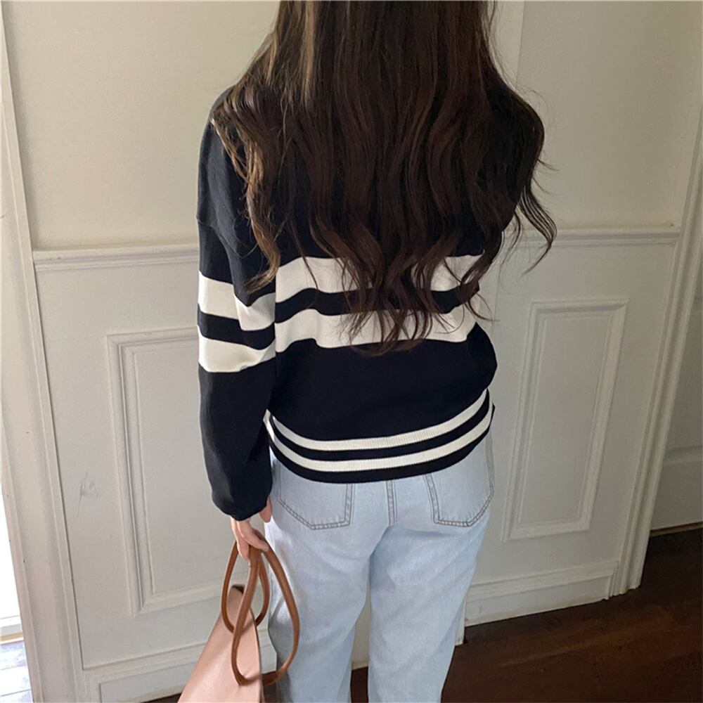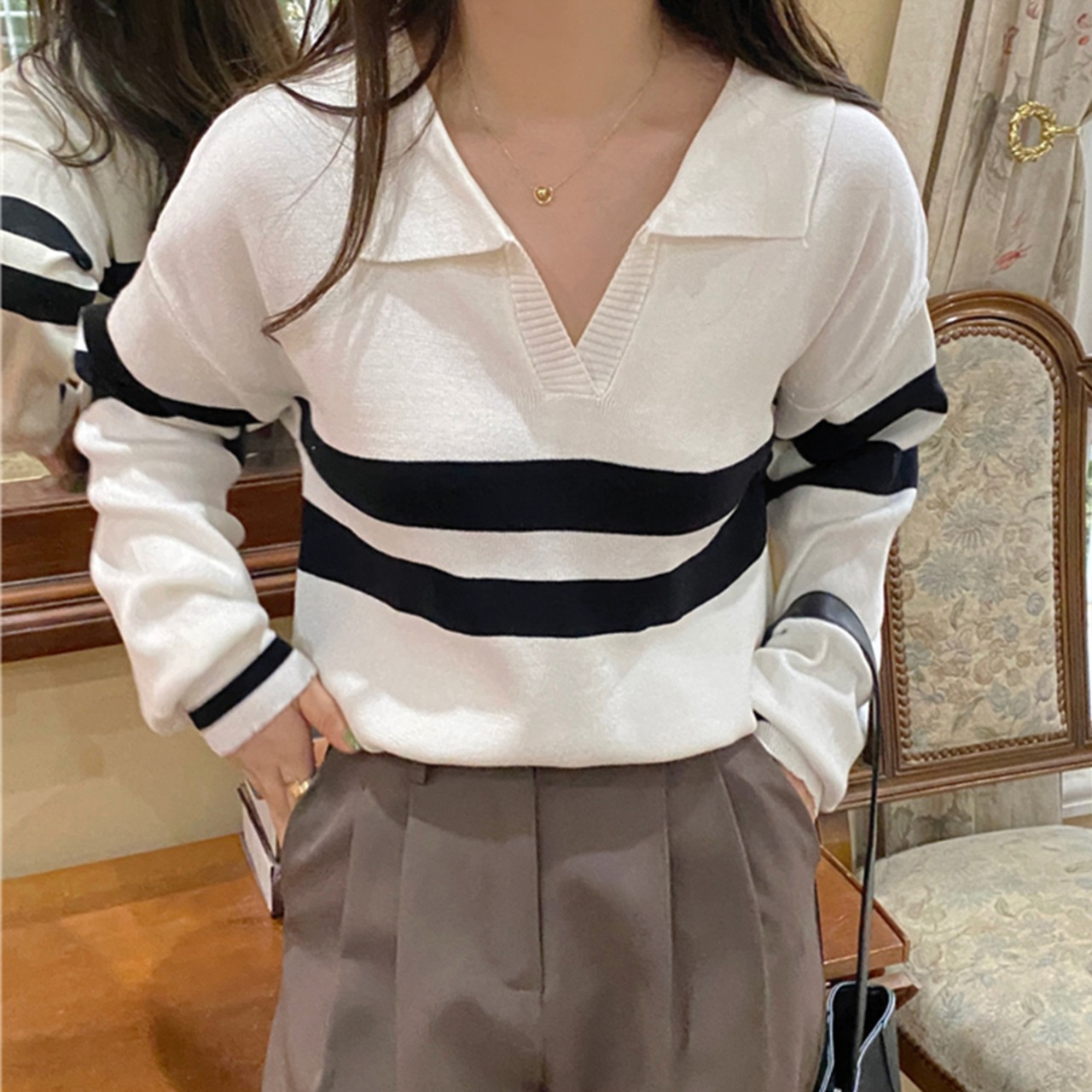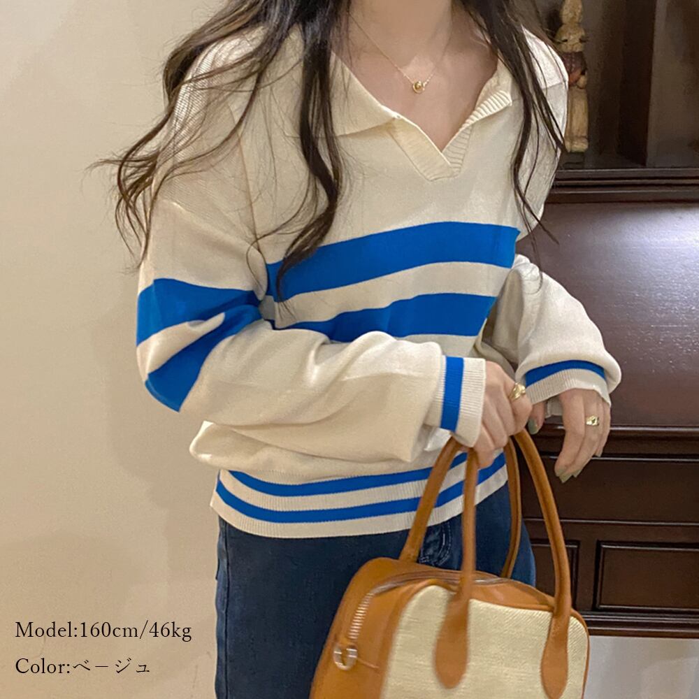 薄手ニット生地で優しい肌触りを与える、角襟のデザインもレトロなお洒落感を演出するニットトップス