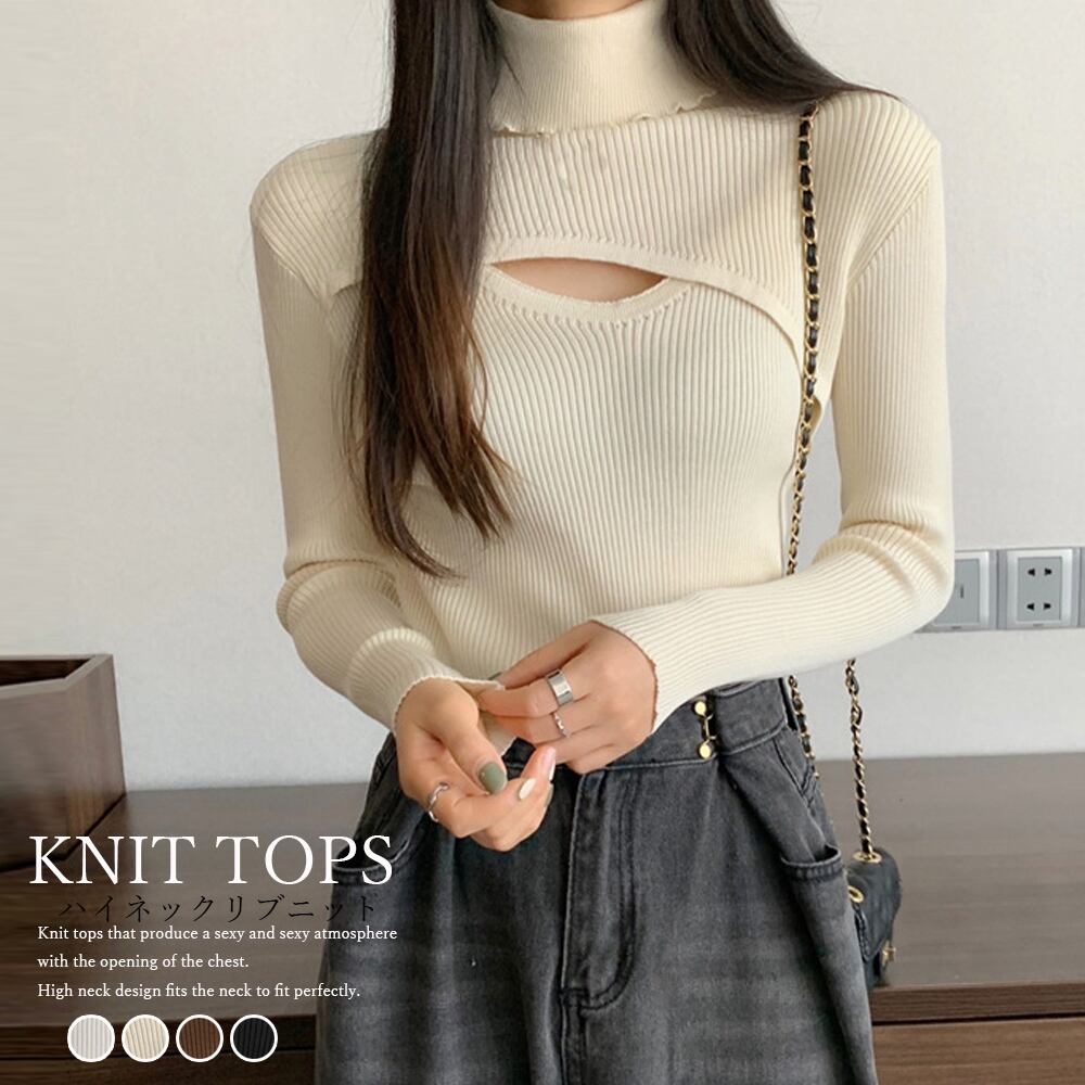 秋冬 リブニット 胸開き ニットソー 重ね着 インナー