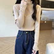 袖と襟にレースがついたフェミニンなハイネックニットトップス