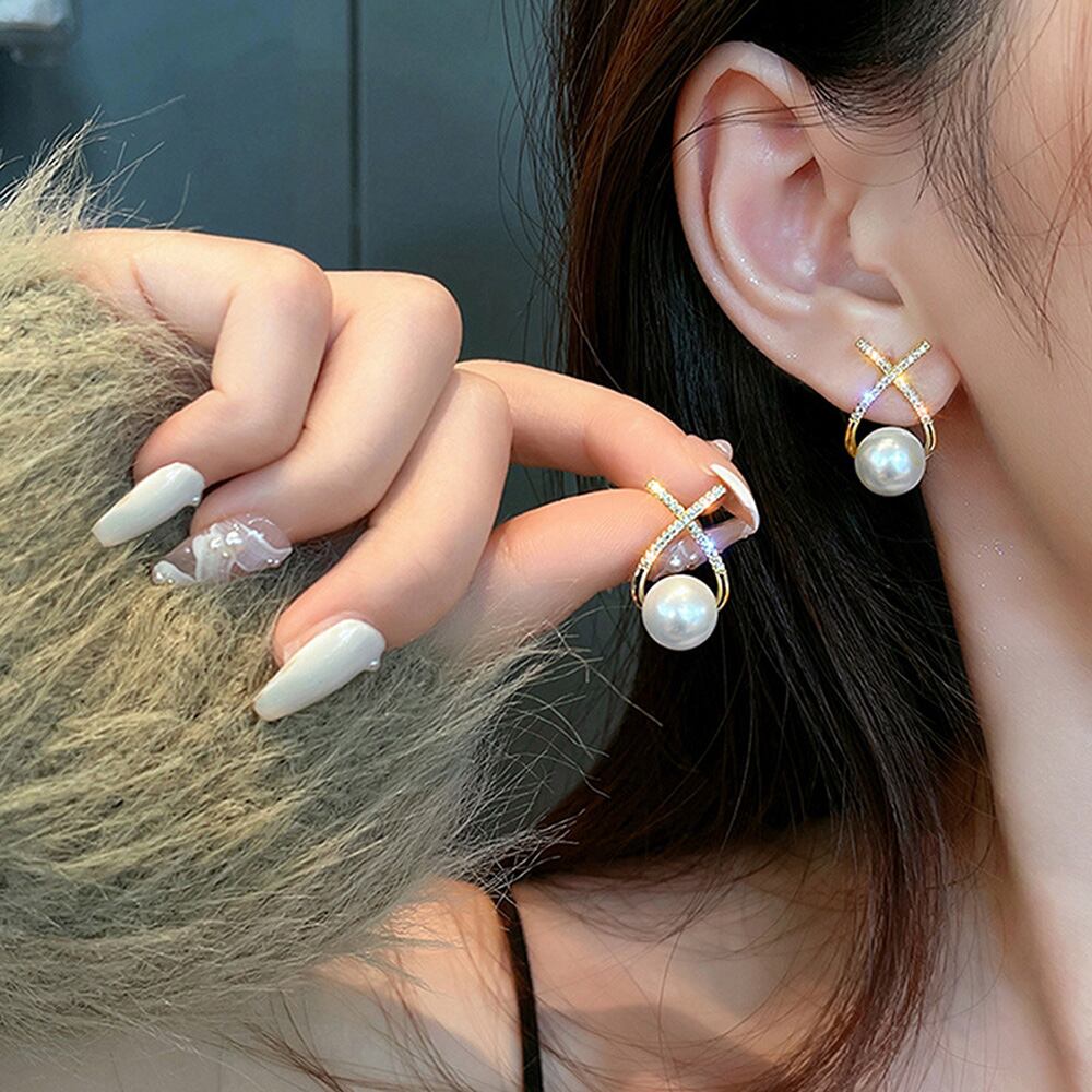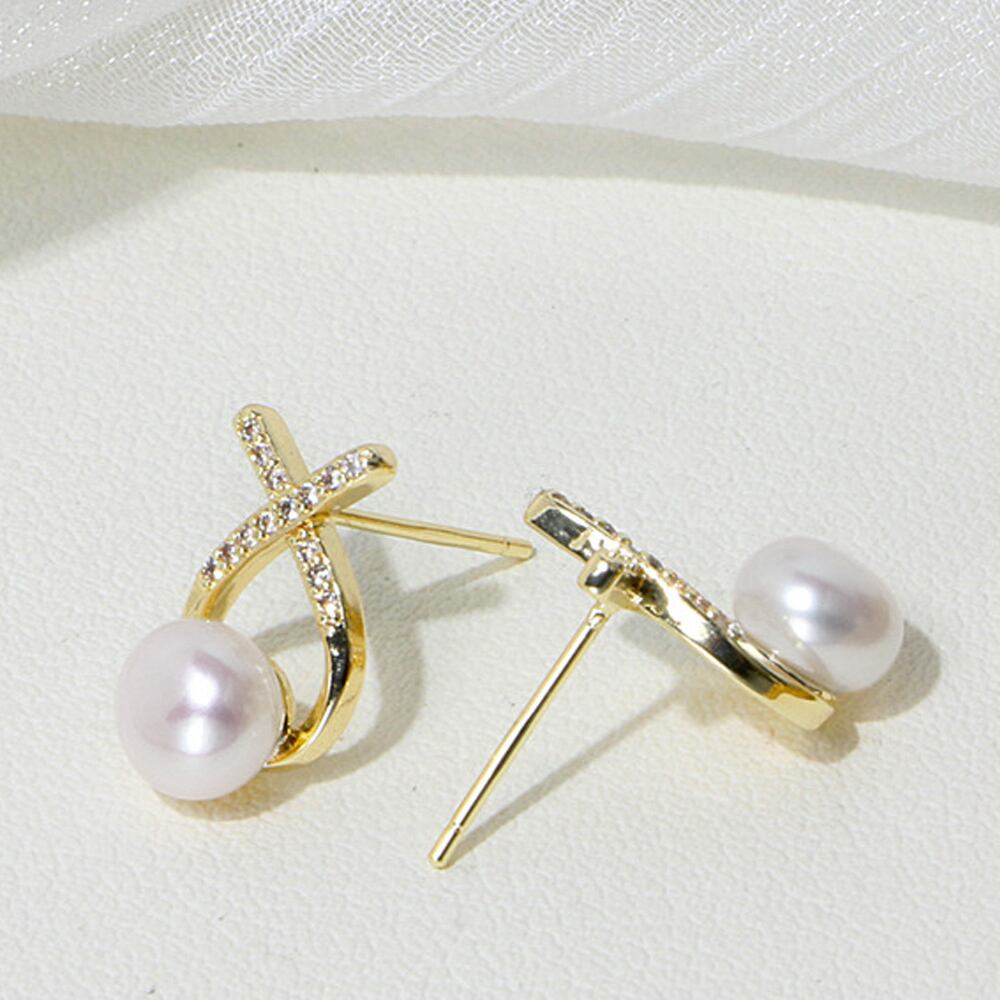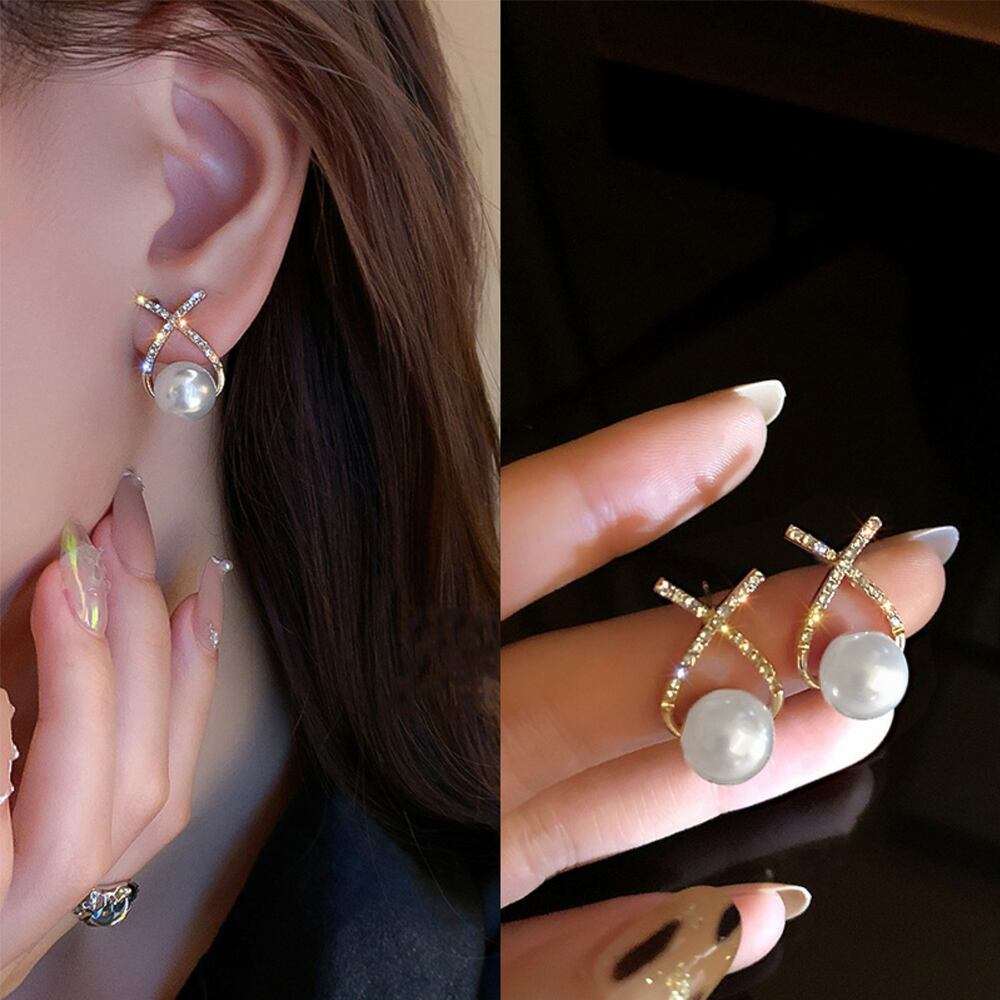 クロスデザインのメタルモチーフときらきら輝くラインストーンに一粒パールのスタッドピアス