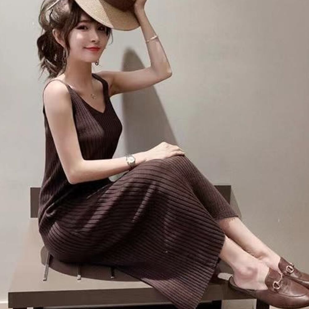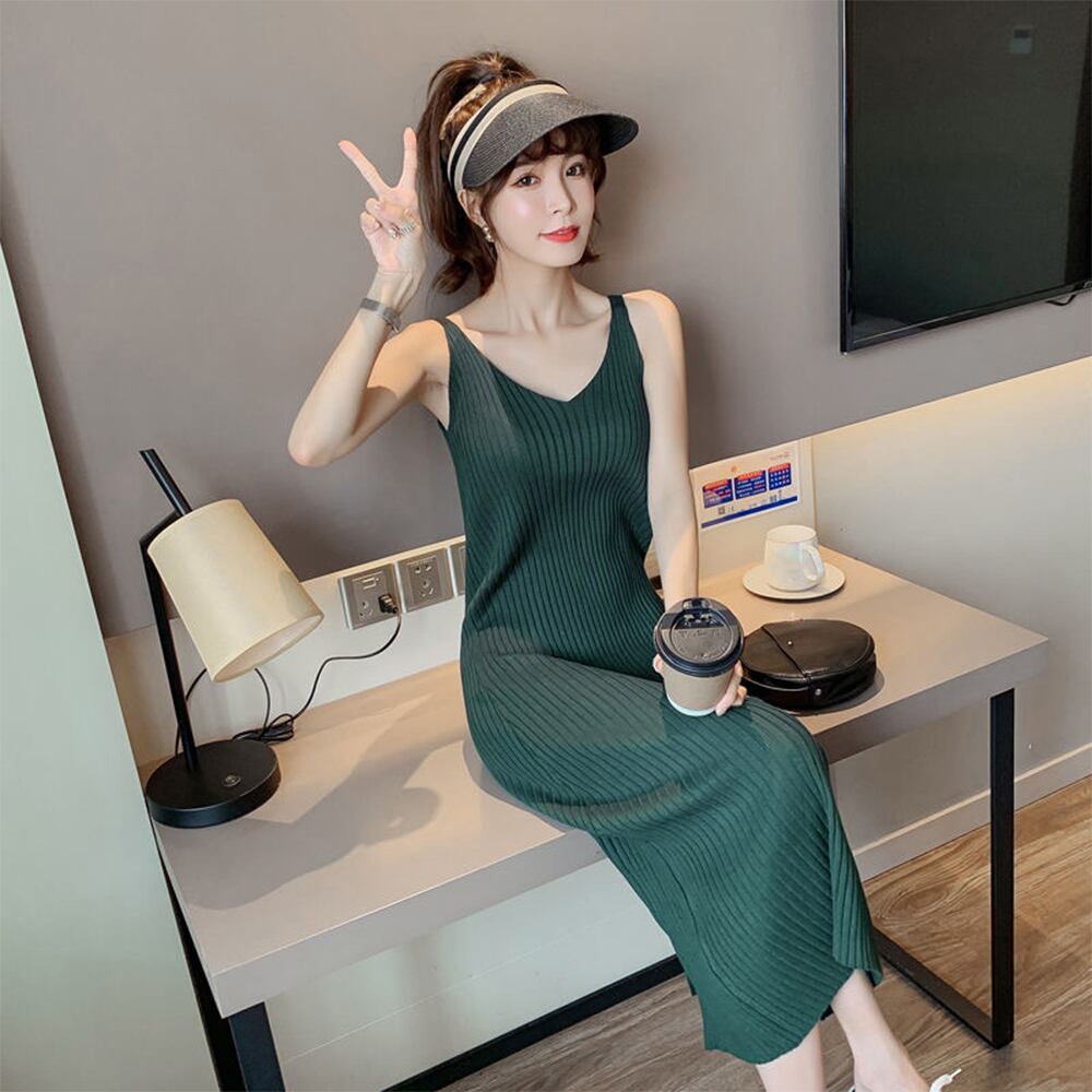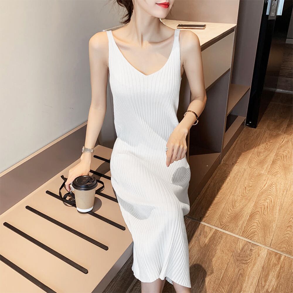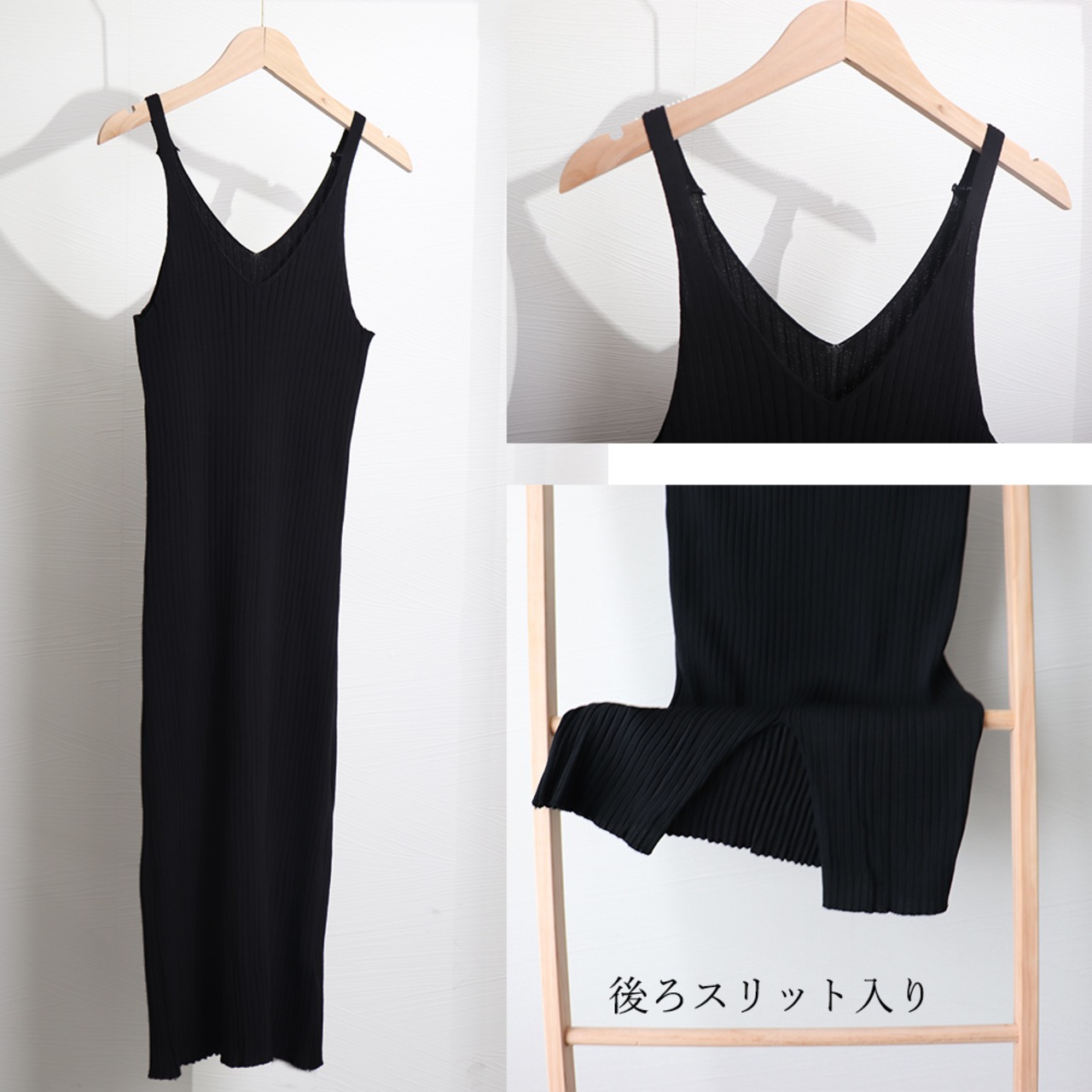 ざっくり開いたVネックが女性らしいシルエットにしてくれるシンプルなニットキャミソールワンピース