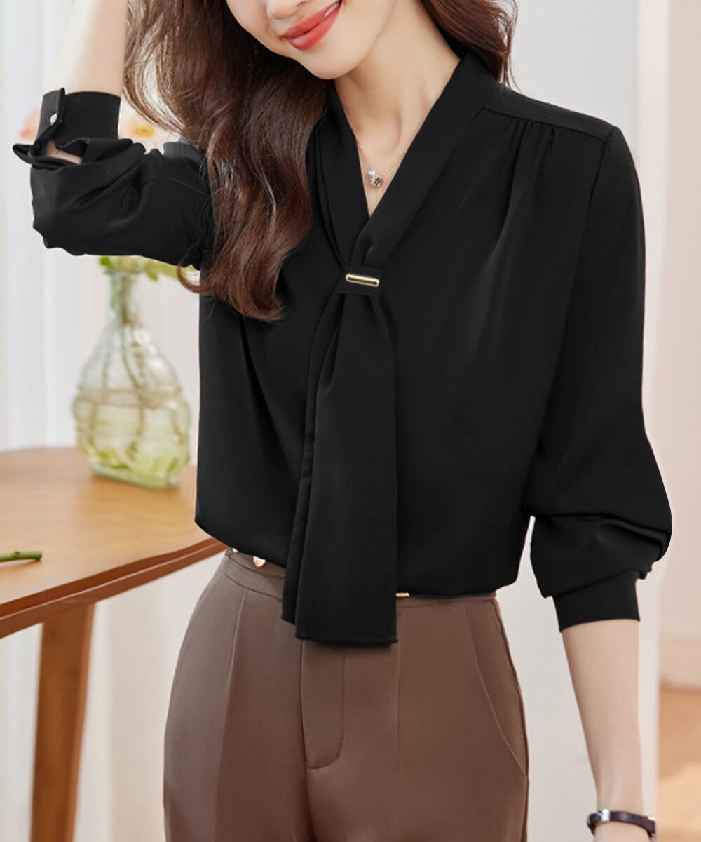 胸元のボウタイが上品な印象にしてくれるVネックブラウス