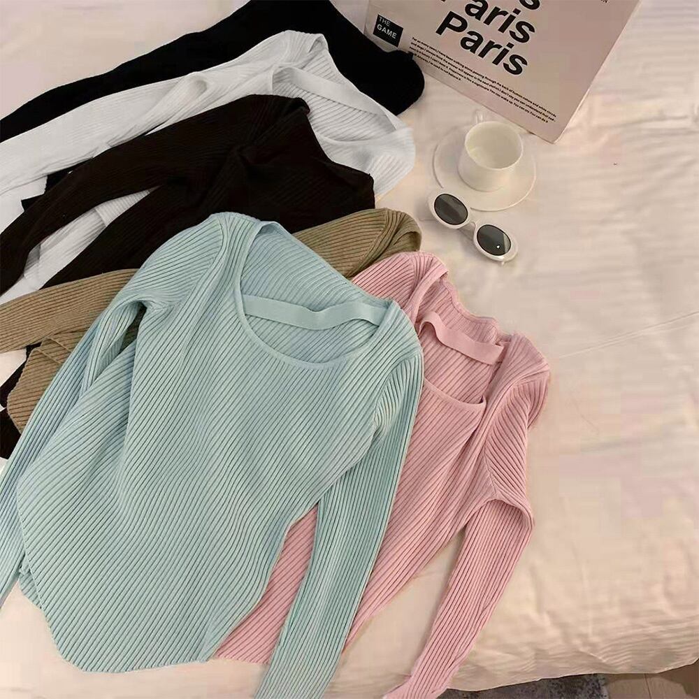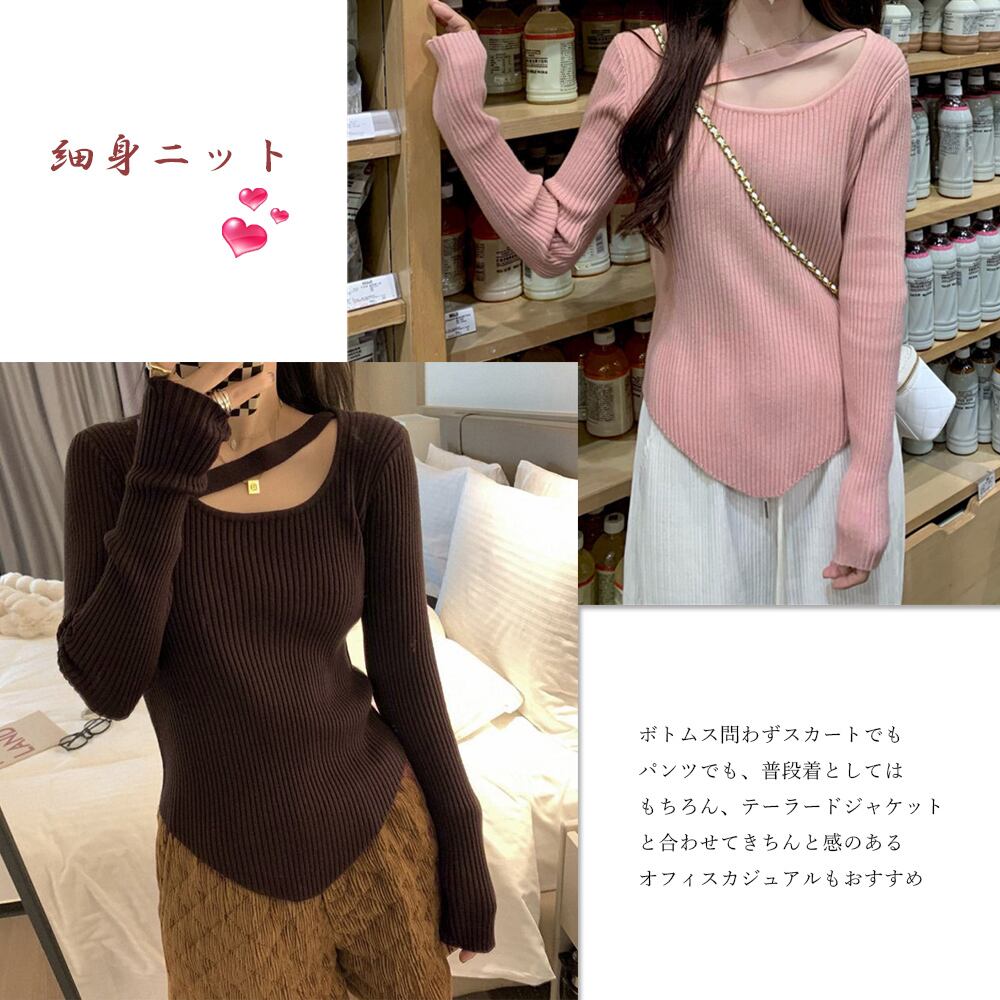 チョーカー風 Uネック 深め ニットソー 長袖 きれいめ 鎖骨見せ ニットプルオーバーアンバランスヘム 春秋冬 新作