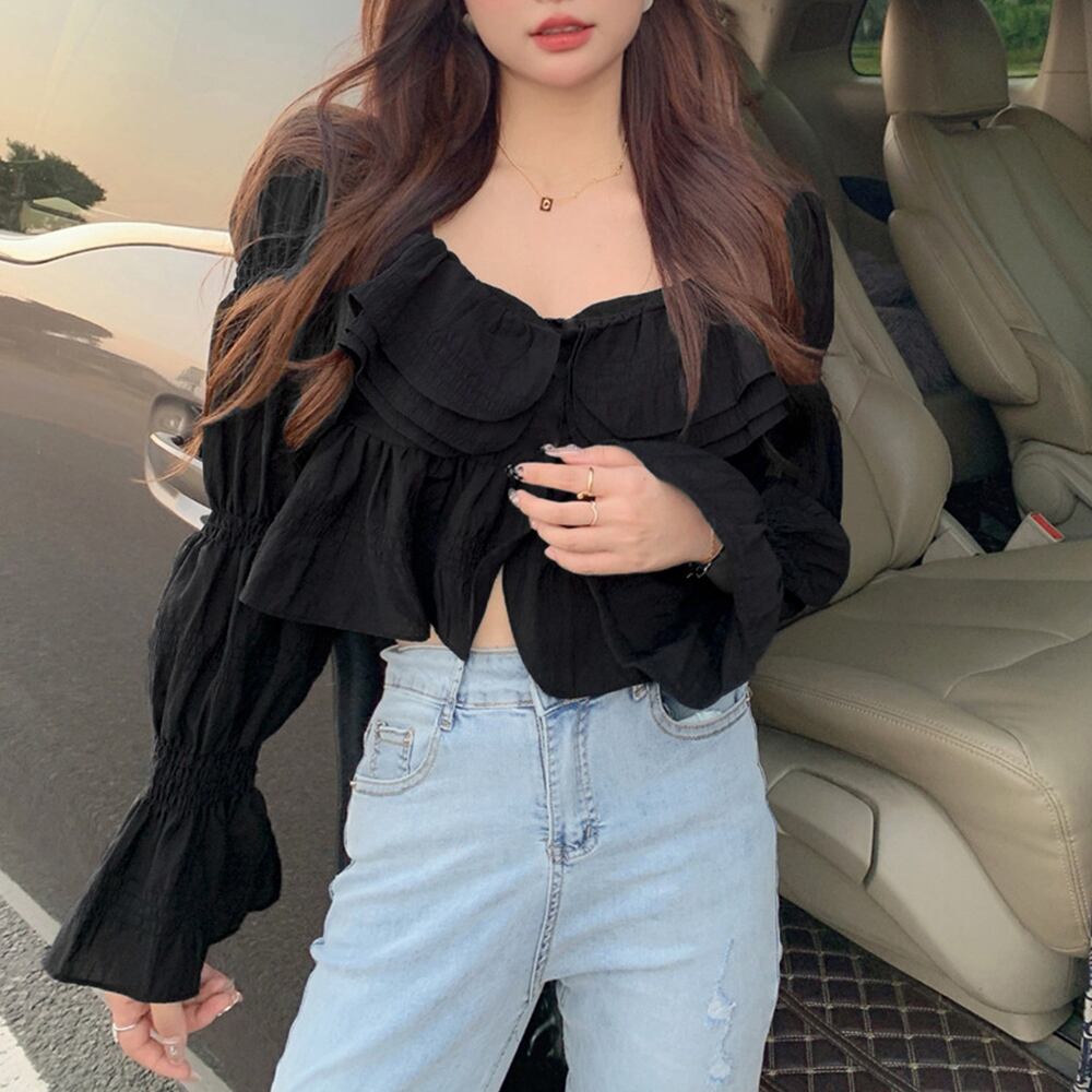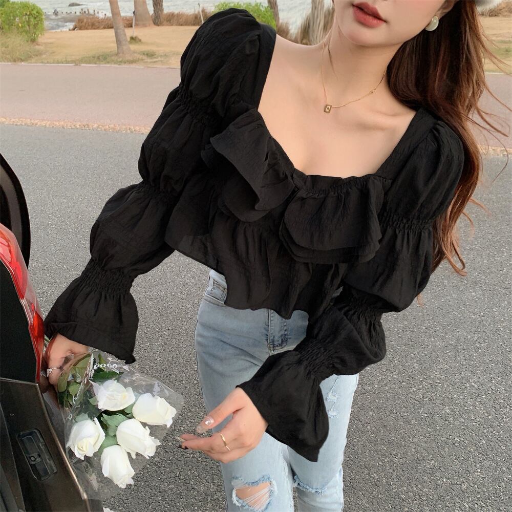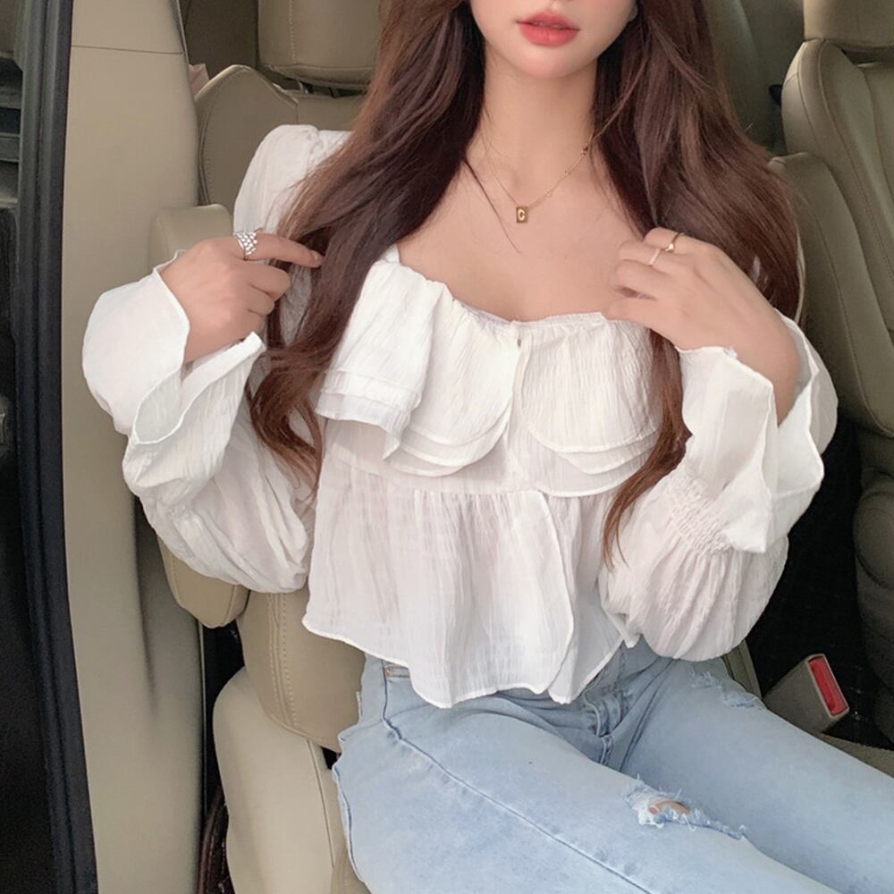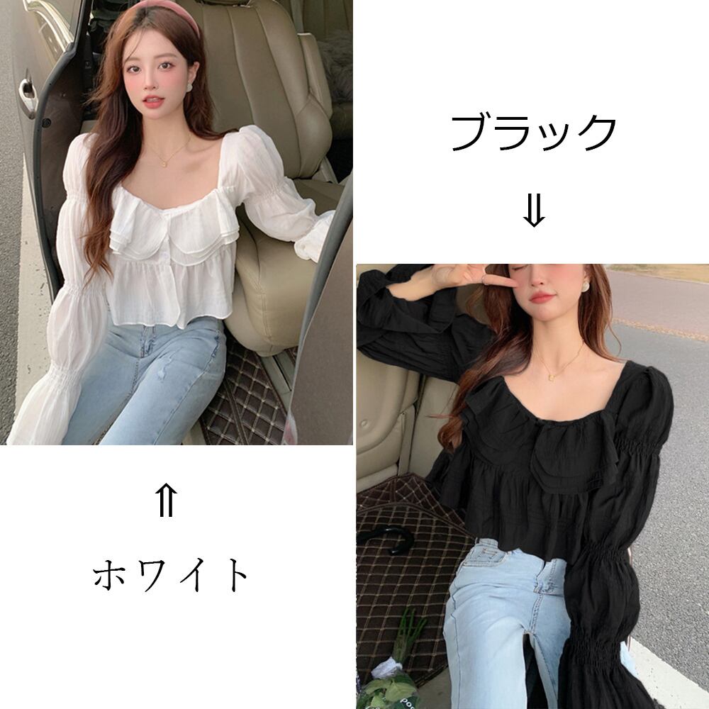 ショート丈トップス レディース パフスリーブ 韓国ファッション シャツブラウス 無地 プルオーバー シャーリング