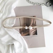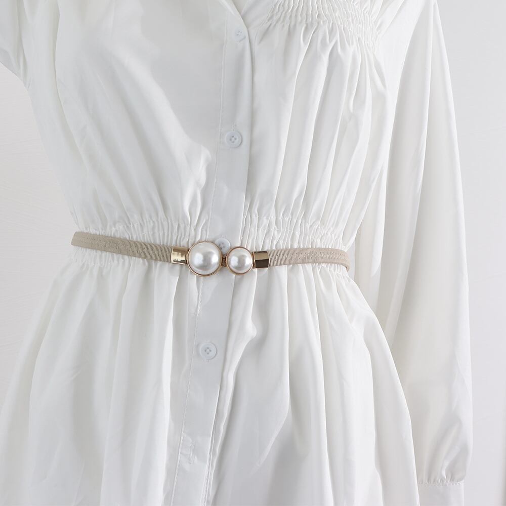 上品なフェイクパールのバックルにゴム素材で仕上げた細めベルトです