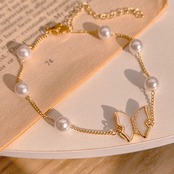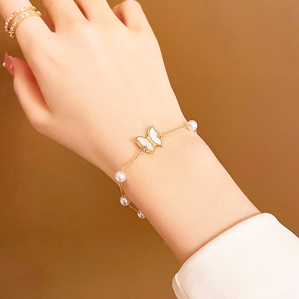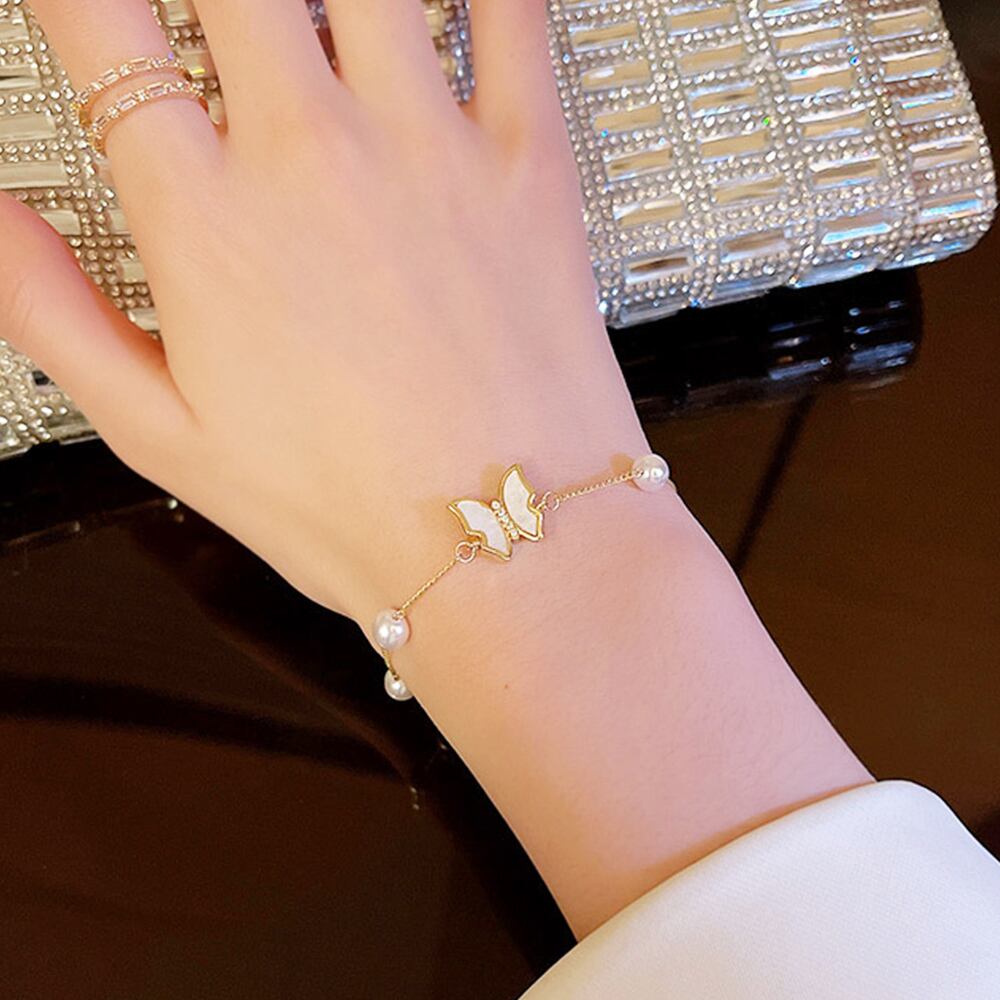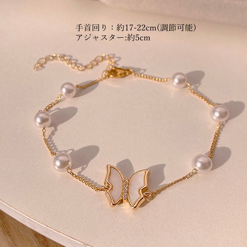 蝶々モチーフに貝殻で飾られたフェイクパールブレスレットです