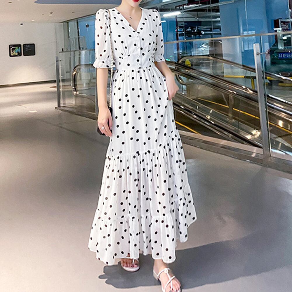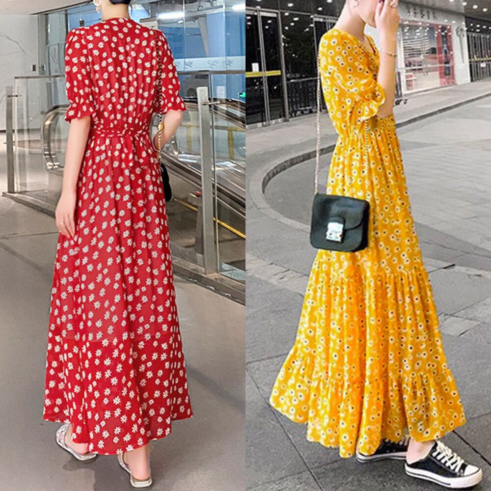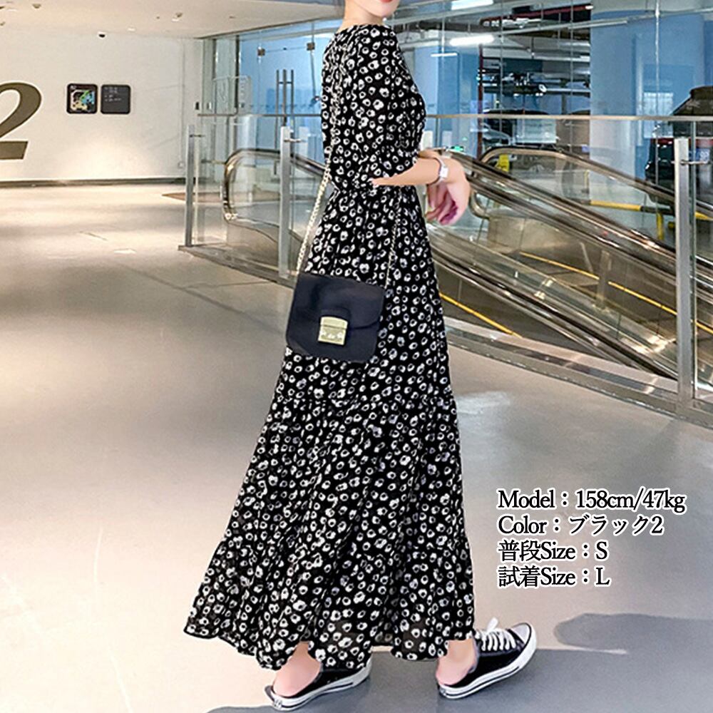 ロングワンピ 薄手 Vネック フレアワンピース 春夏コーデ 花柄ワンピ 半袖 フリル袖 リゾートワンピース 体型カバー