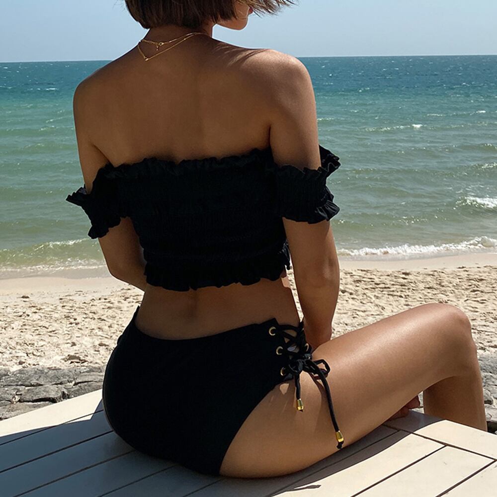 フリルと両肩を露出させたデザインで、首回りを華奢に見せてくれるオフショルダービキニセット。