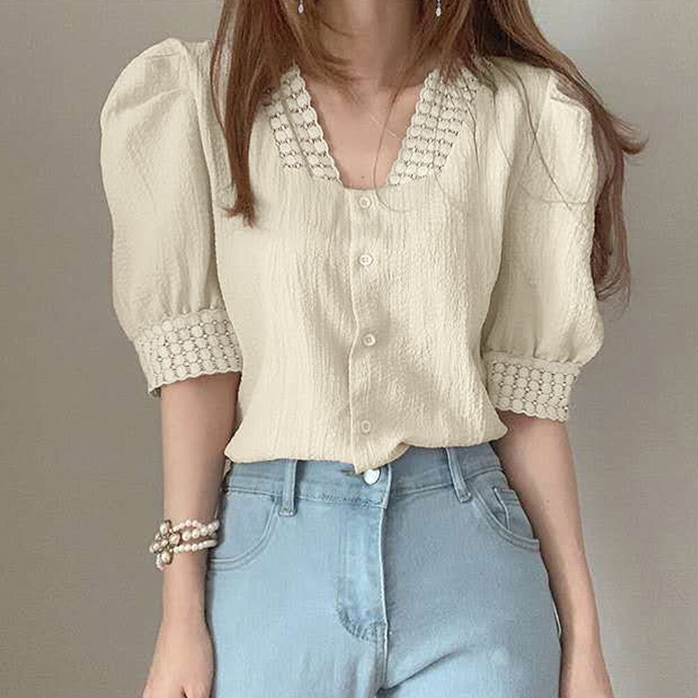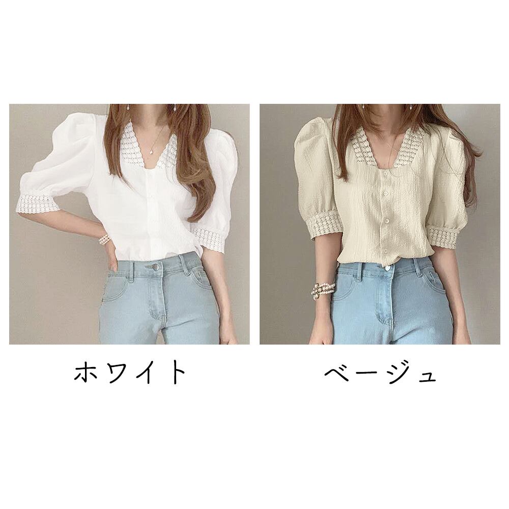 半袖シャツ 透け感 薄手 Vネック パフスリーブ 刺しゅう 着やせ オルチャン 大人 カジュアル お洒落 可愛い