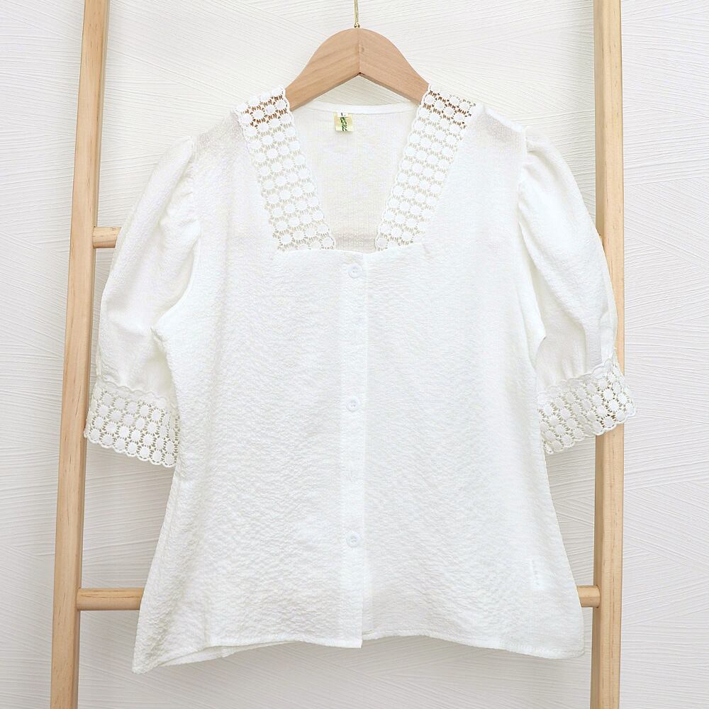 ネックからフロントボタンにかけては立体感のでるレースが施されているのでより高見えするデザインに。