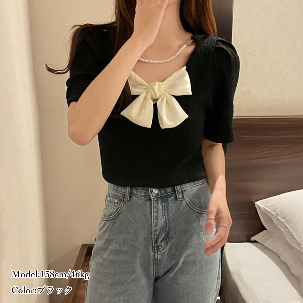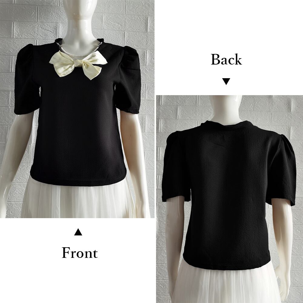 胸元に可愛く飾る大きなリボンと取り外し可能なパールネックレス付きのトップス