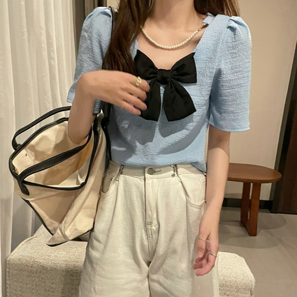 トップス フェミニン 大きなリボン付き ブラウス 無地 可愛い 薄手 シャツブラウス プルオーバー