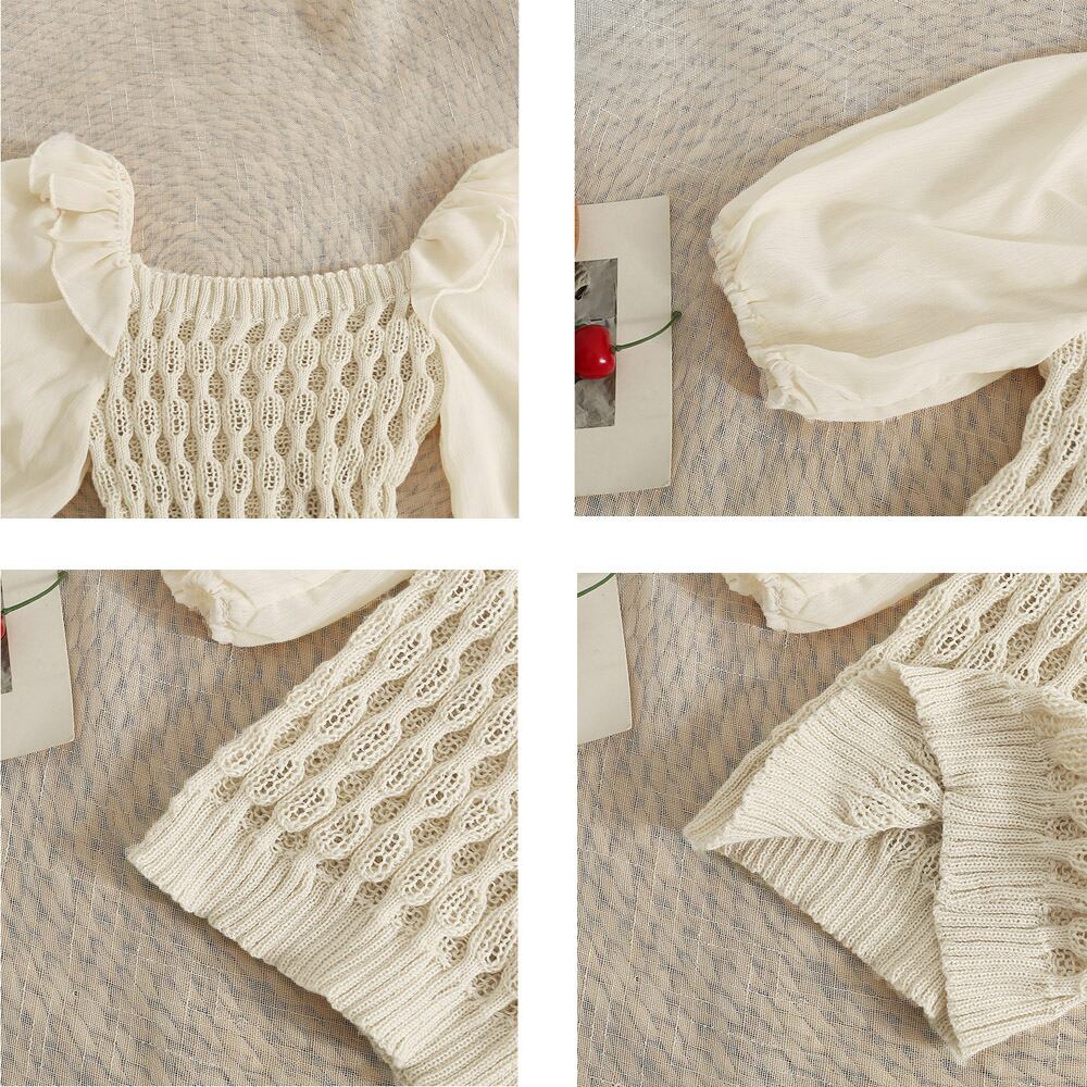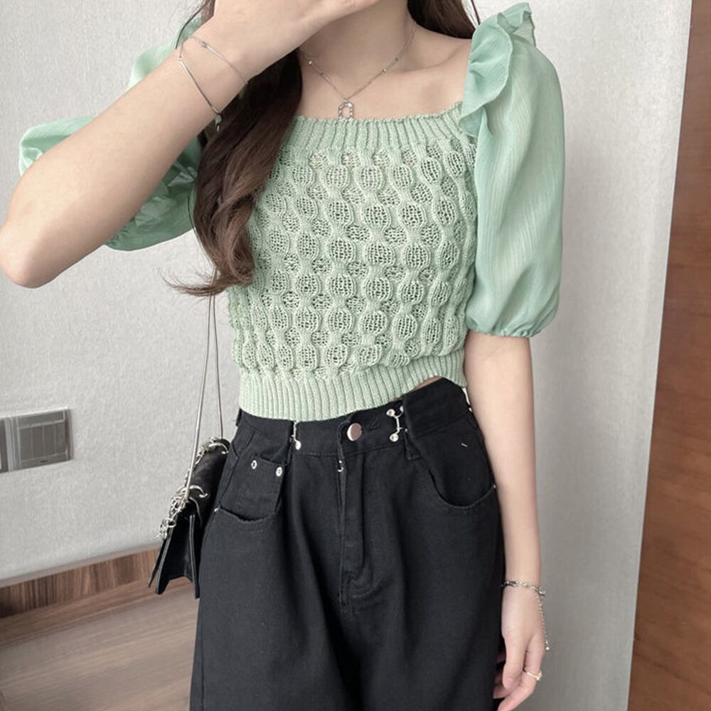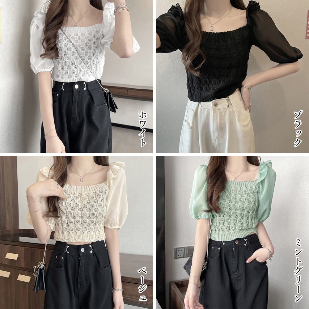 ドッキングシャツ 異素材ミックス パフスリーブ ニットブラウス 韓国風 ショート丈 ニットトップス 春夏 大人可愛い
