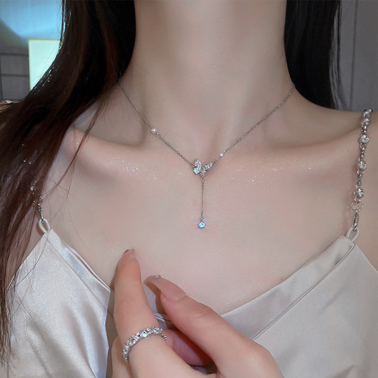 華奢で女性らしい細さのチェーンで着けやすく、トレンドを押さえた蝶々モチーフのチェーンネックレス。