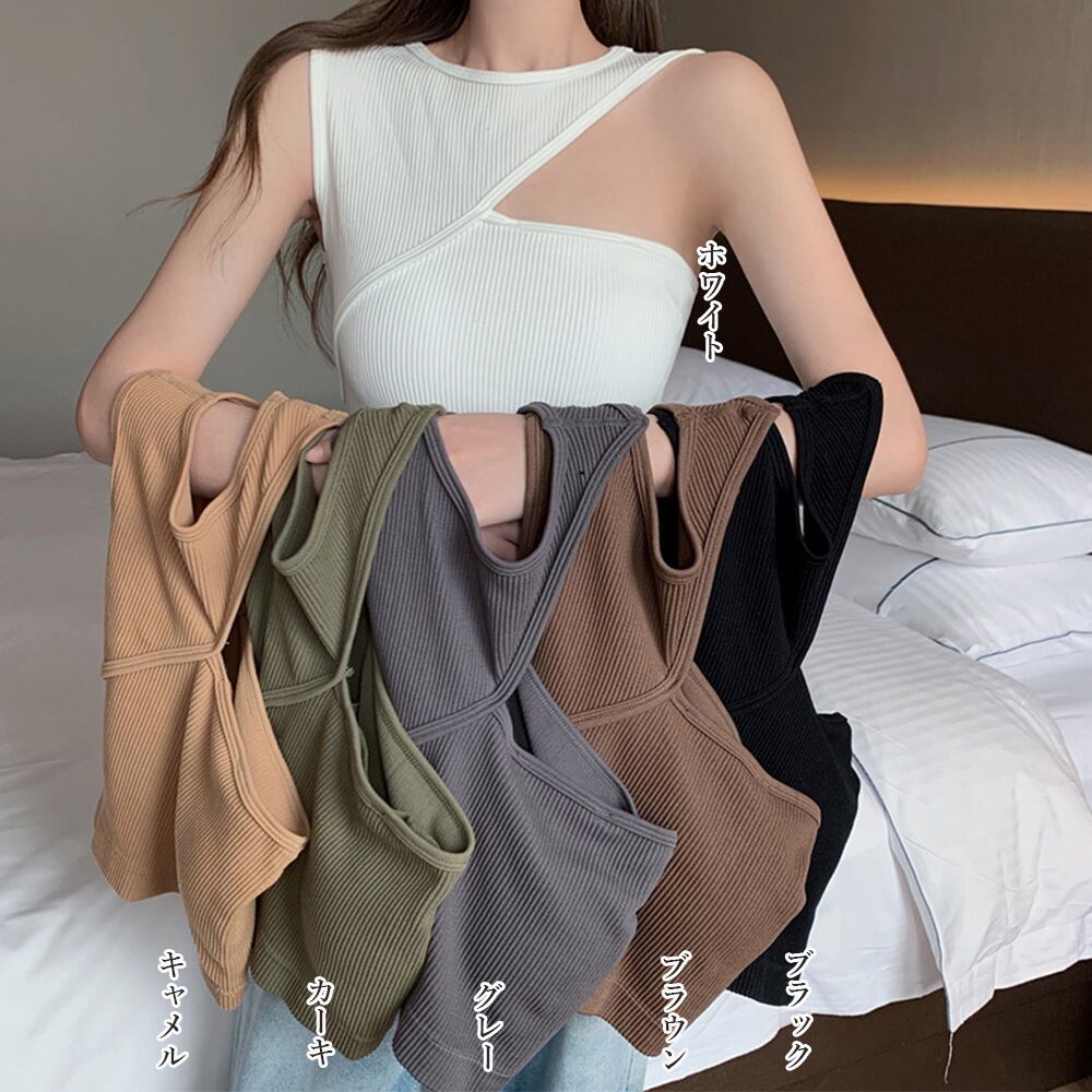 アシンメトリーで露出が多すぎないカッティングでヘルシーな印象の肌見せが楽しめて、カットアウトのディティールが今年らしさ満載のタンクトップ