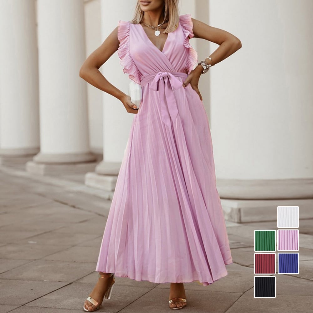 上品で優雅な印象を与えるプリーツロングワンピース。