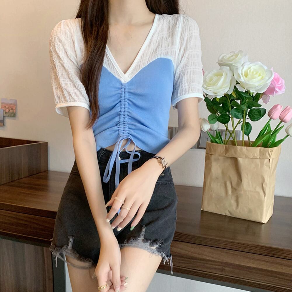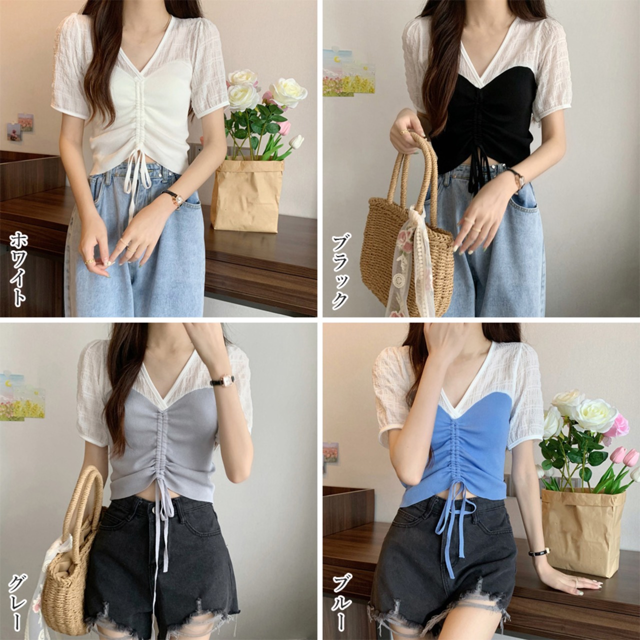 ドッキングニット レディース 異素材切り替え ブラウス 薄手 ニットシャツ細身 ショート丈ブラウス お洒落