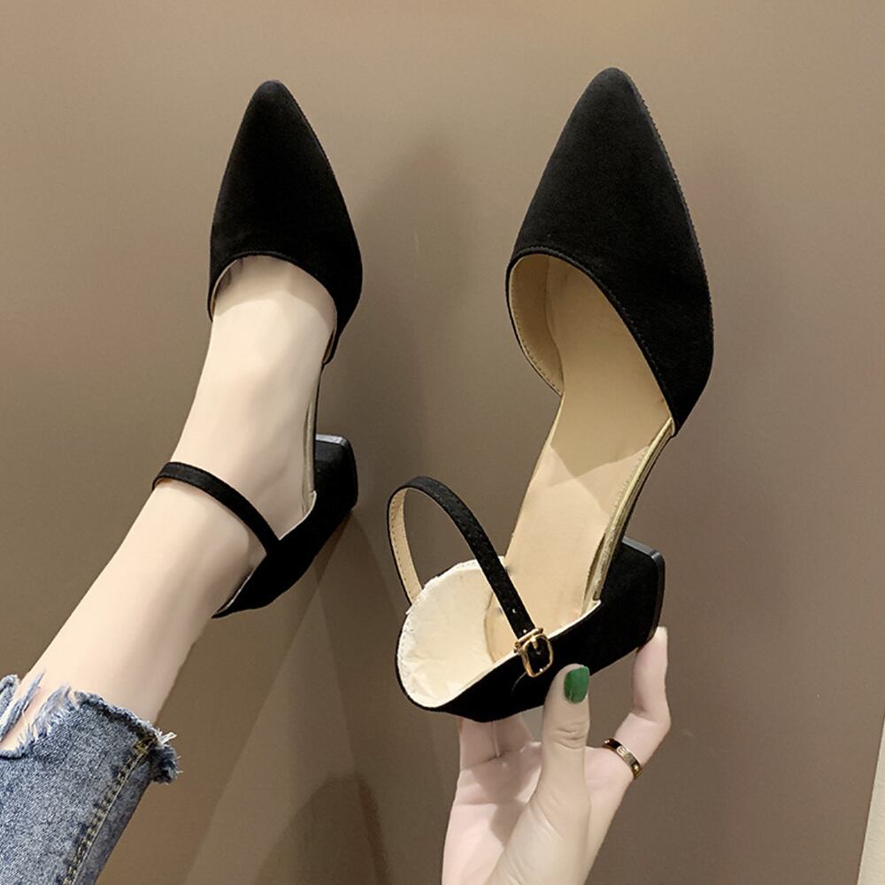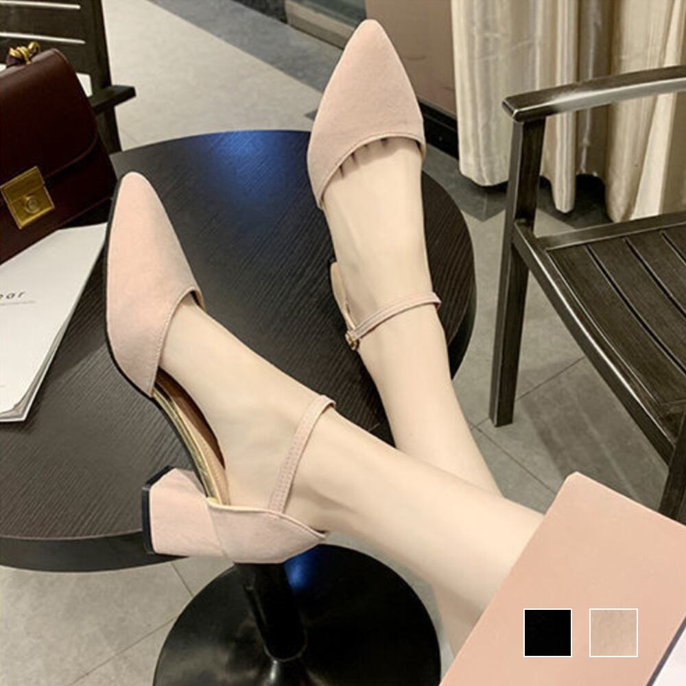 フェミニン アンクルストラップ パンプス チャンキーヒール 歩きやすい ポインテッドトゥ 大人美脚 シューズ パーティー