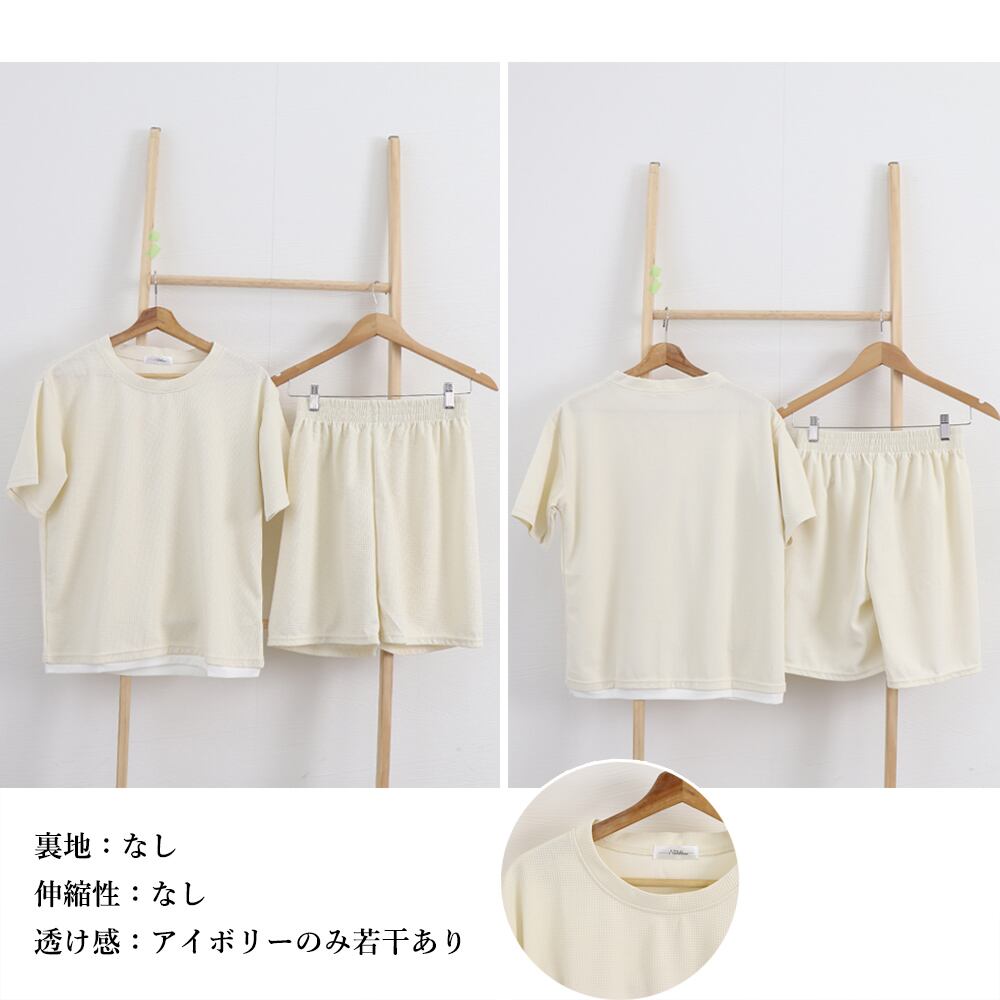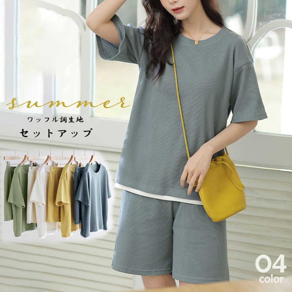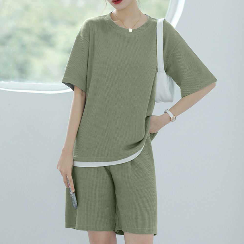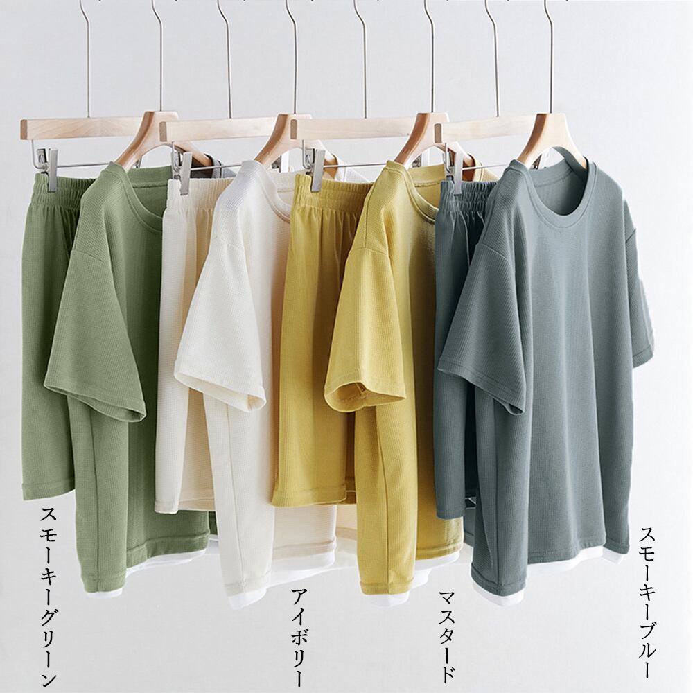 無地半袖 カットソーTシャツ ショートパンツ 2点セット サマー韓国カジュアル 部屋着ワッフルルームウェア スウェット