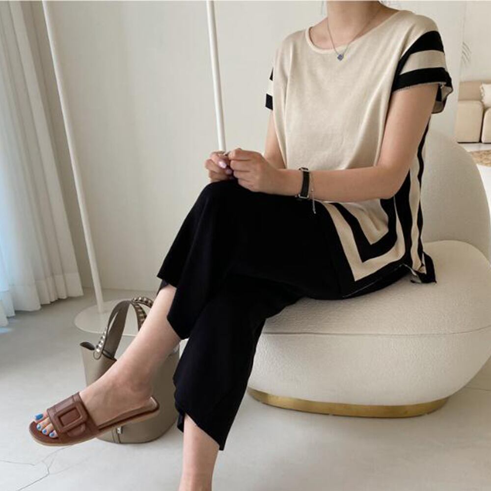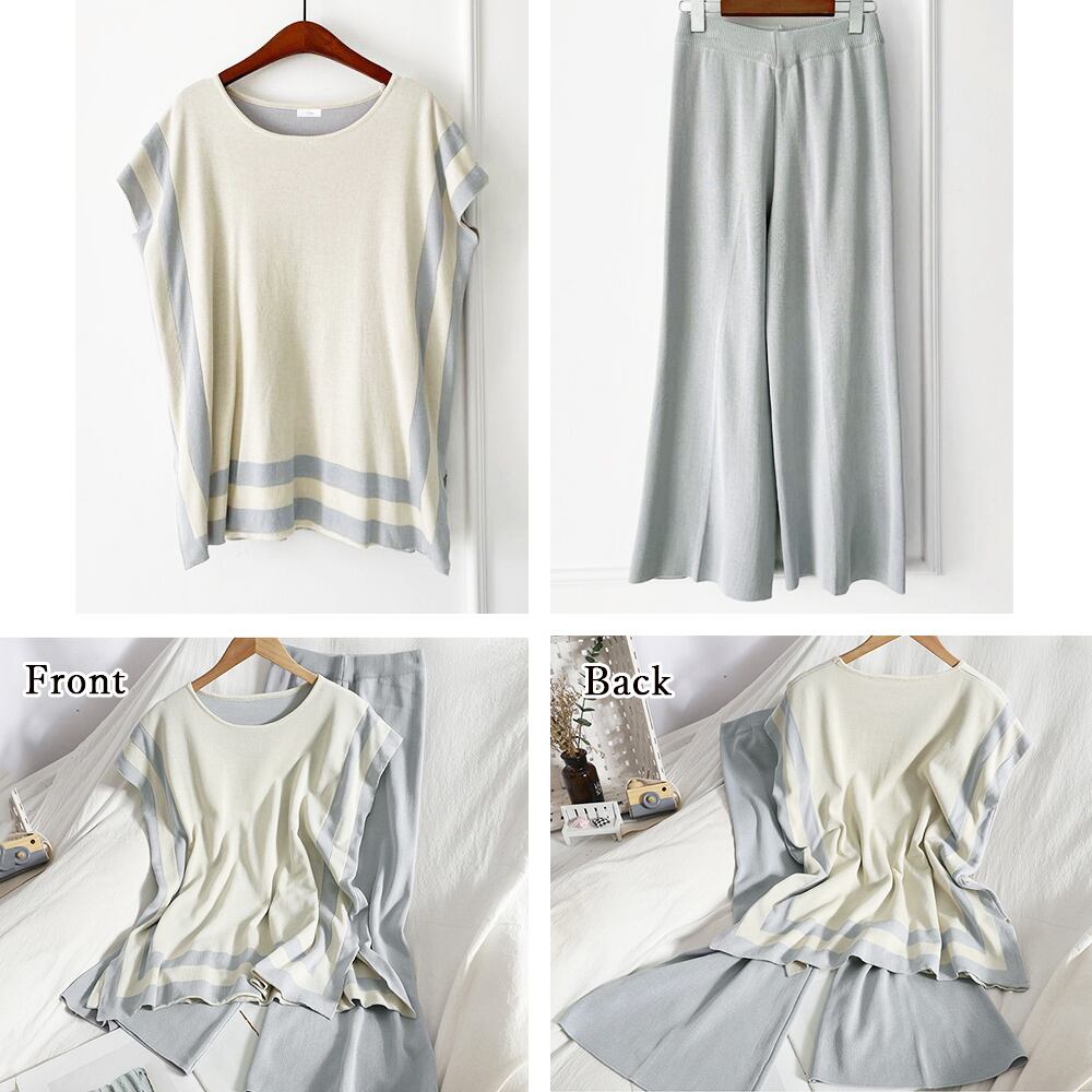 サマーニット スリットトップス ワイドパンツ 2点セット ゆったり オフィスカジュアル フレンチ袖ニット きれいめ 薄手