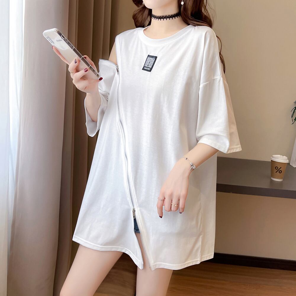 レディース 夏服 Tシャツ 体型カバー ファスナー付き 肌見せ プルオーバー カジュアル トップス