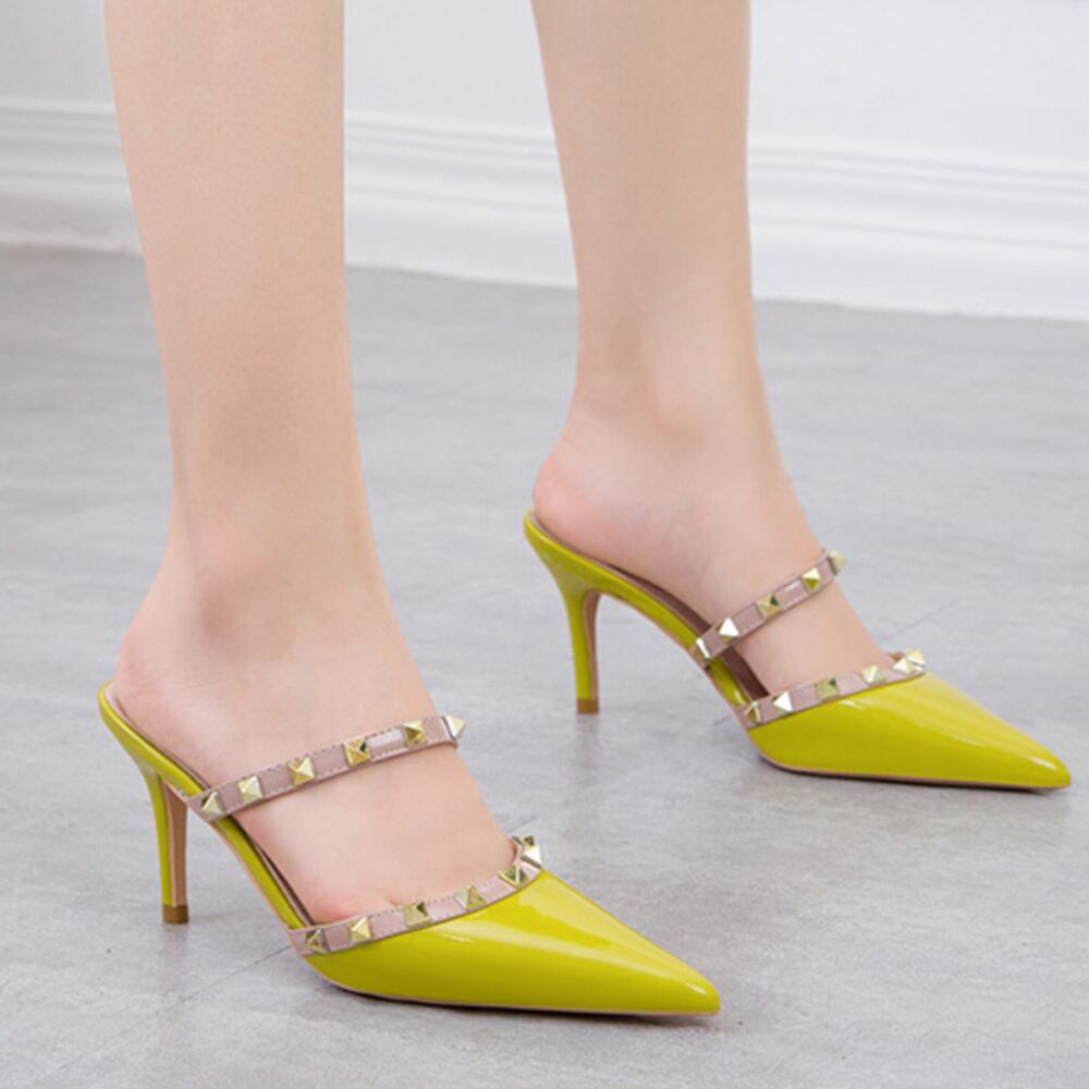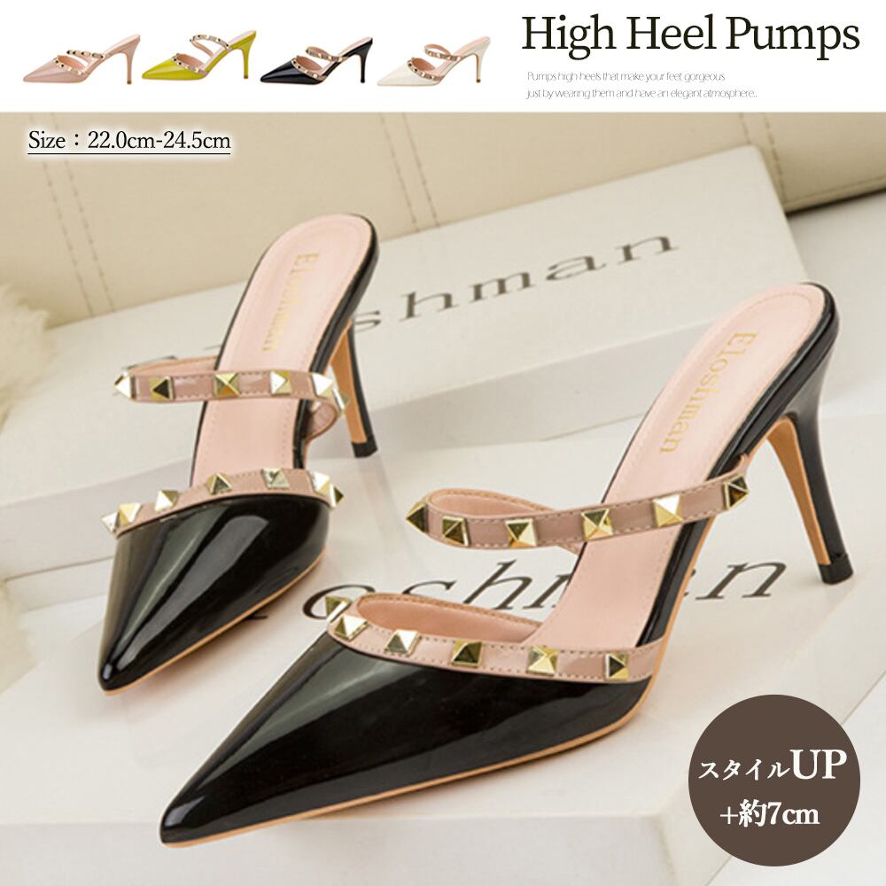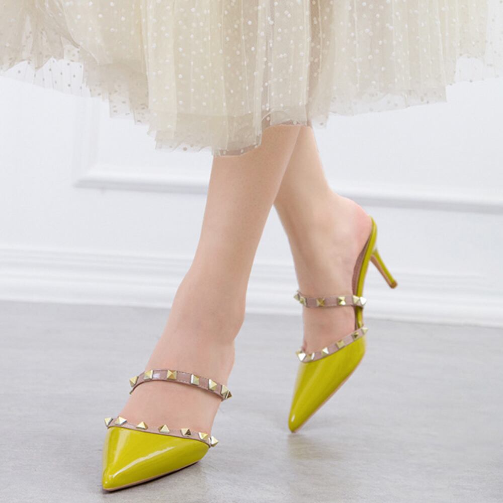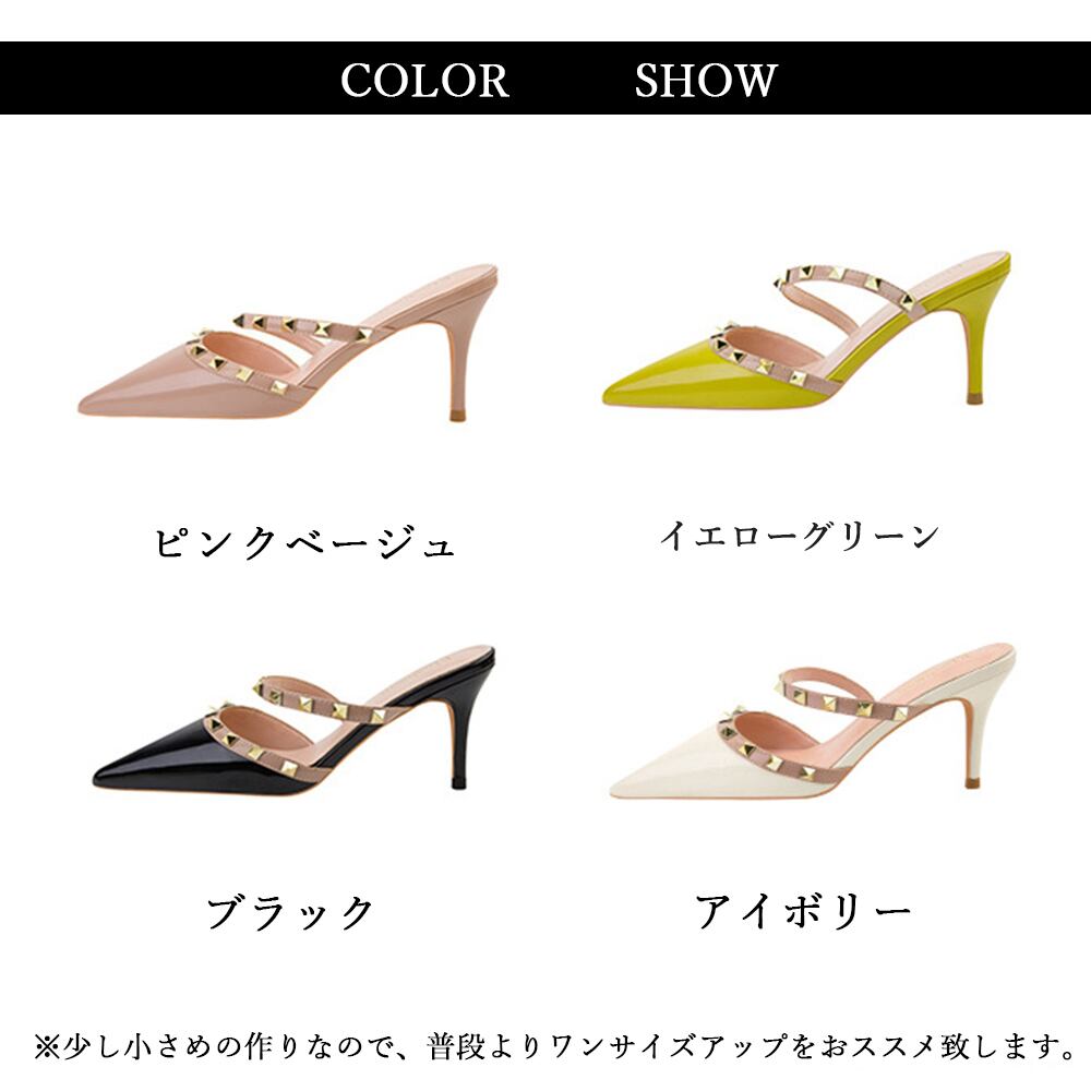 ミュールサンダル リベット ヒールサンダル ポインテッドトゥ 美脚結婚式 靴 パーティー 大人可愛いシューズ エレガント
