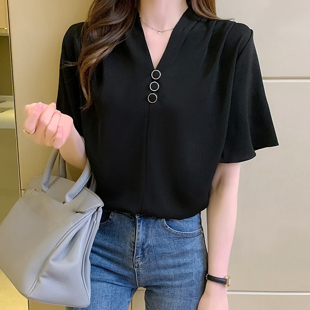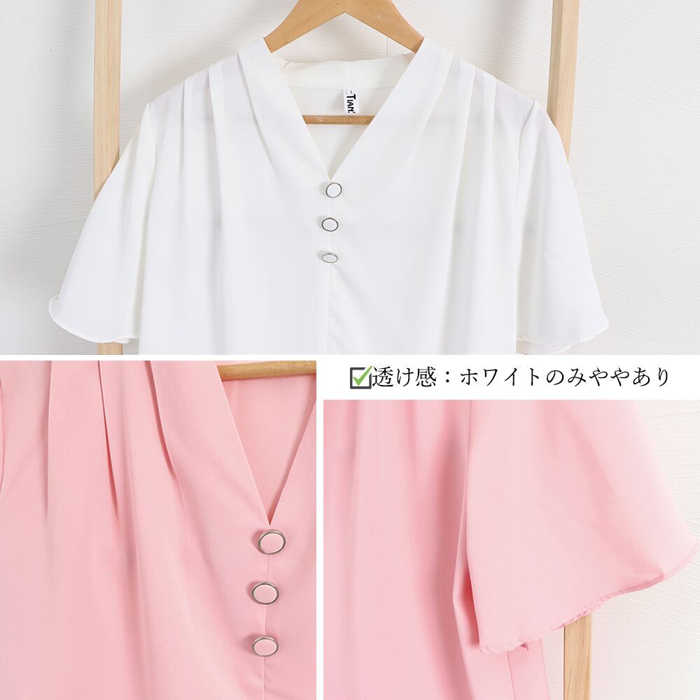 Vネック ラッフルスリーブ ブラウス オフィスカジュアル 大人夏服 きれいめ シャツブラウス 黒白トップス無地フェミニン