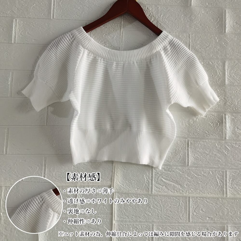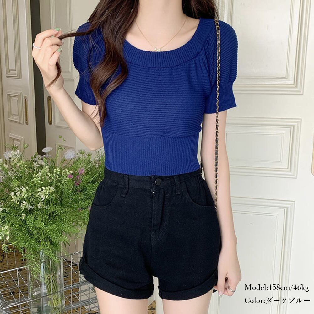 レディース 肩出し サマーニット ショート丈 リブニット セクシー 着やせ ニットソー鎖骨見せ トップス パフスリーブ