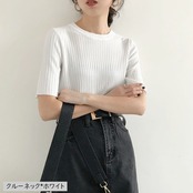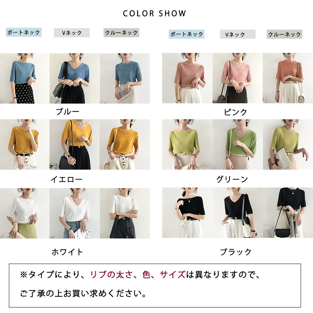 韓国風 冷感タッチ サマーニット Vネック ボートネック クルーネック夏トップス 無地 着やせ きれいめ 大人カットソー