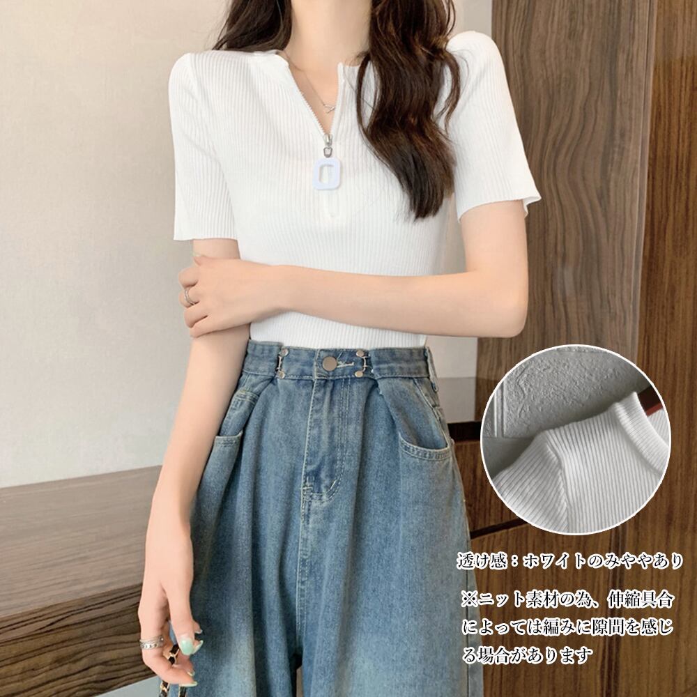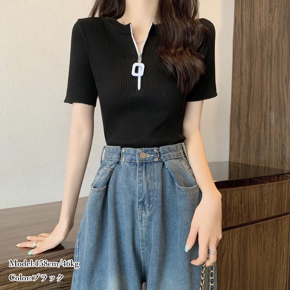 ファスナー付き 韓国風 リブニット 着やせ 半袖 ニットTシャツ シンプル カジュアルニットソー 春秋夏 トップス
