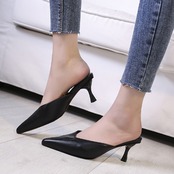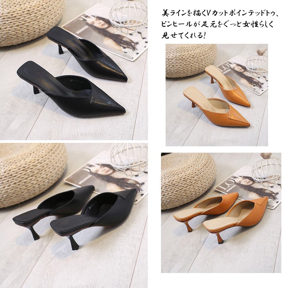美ラインを描くVカットポインテッドトゥ、ピンヒールが足元をぐっと女性らしく見せてくれるヒールミュール