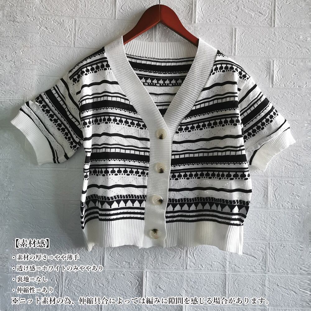 ノーカラー半袖羽織 春夏 柄ニット ショート丈トップス