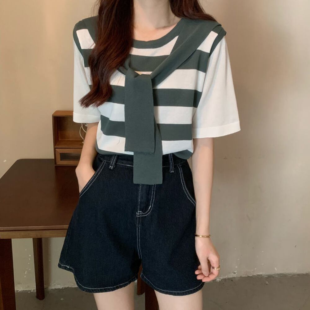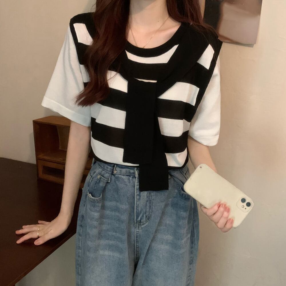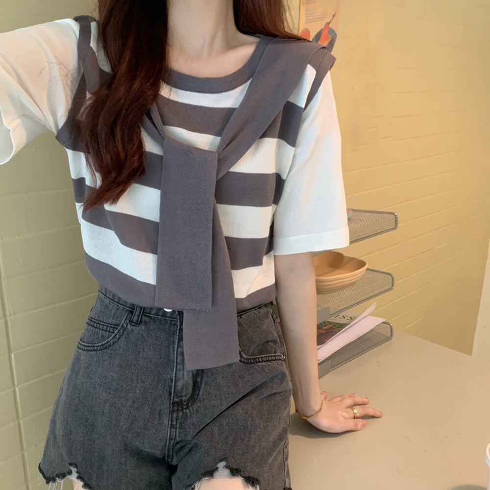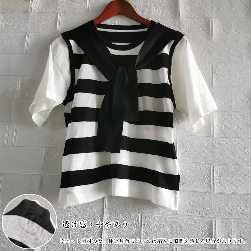 どんなボトムとも相性バツグンなボーダー柄のレイヤード風サマーニット